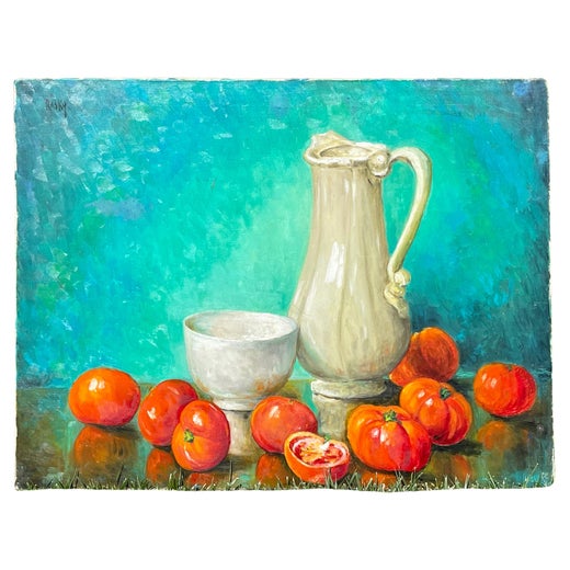Öl auf Leinwand ohne Rahmen mit dem Titel "Tomaten und Topf" signiert und gegengezeichnet "RASKY". Diese Leinwand ist in sehr gutem Zustand.