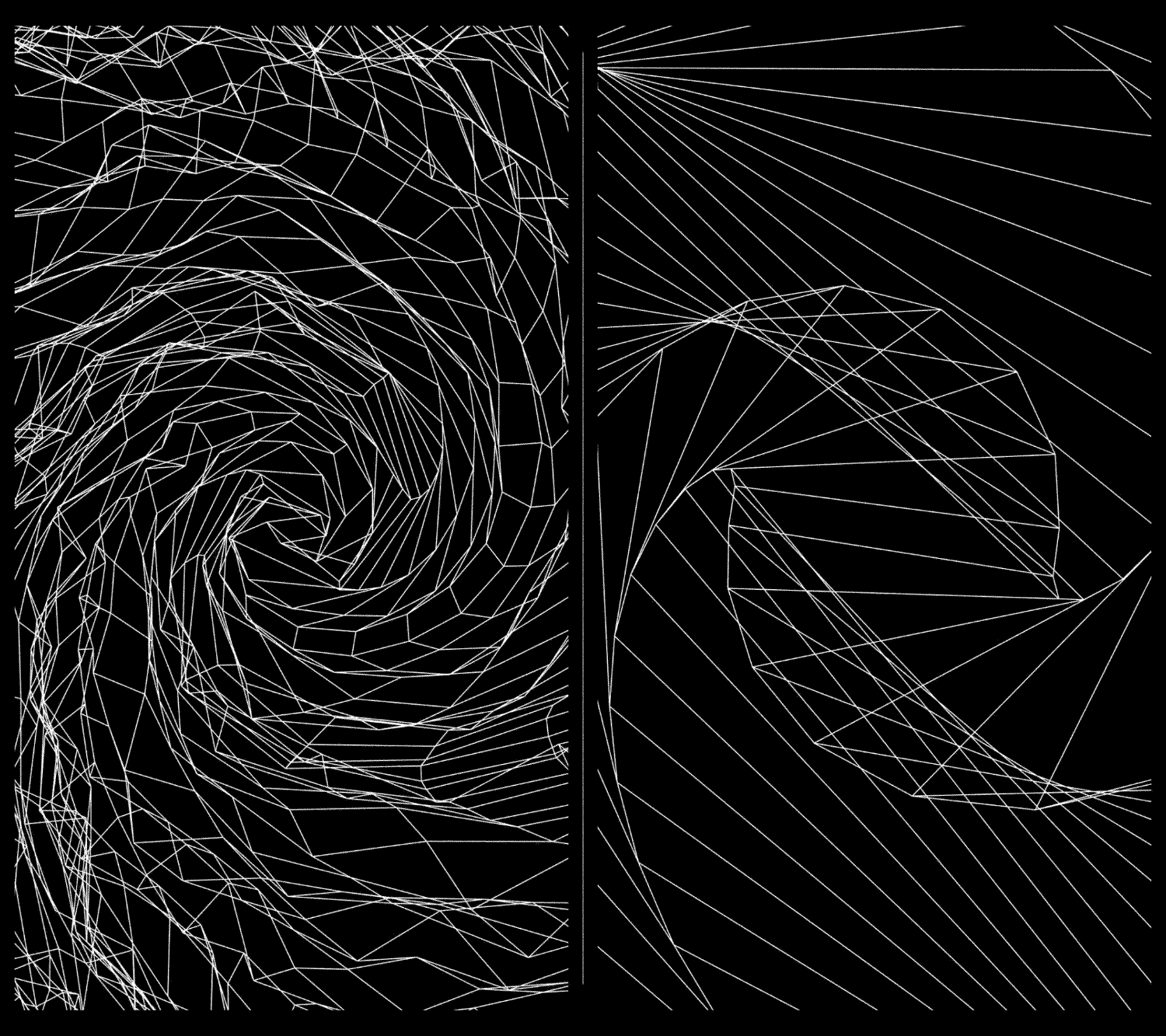 Straight lines moving in constant curves in opposite directions.