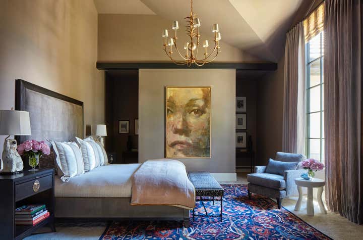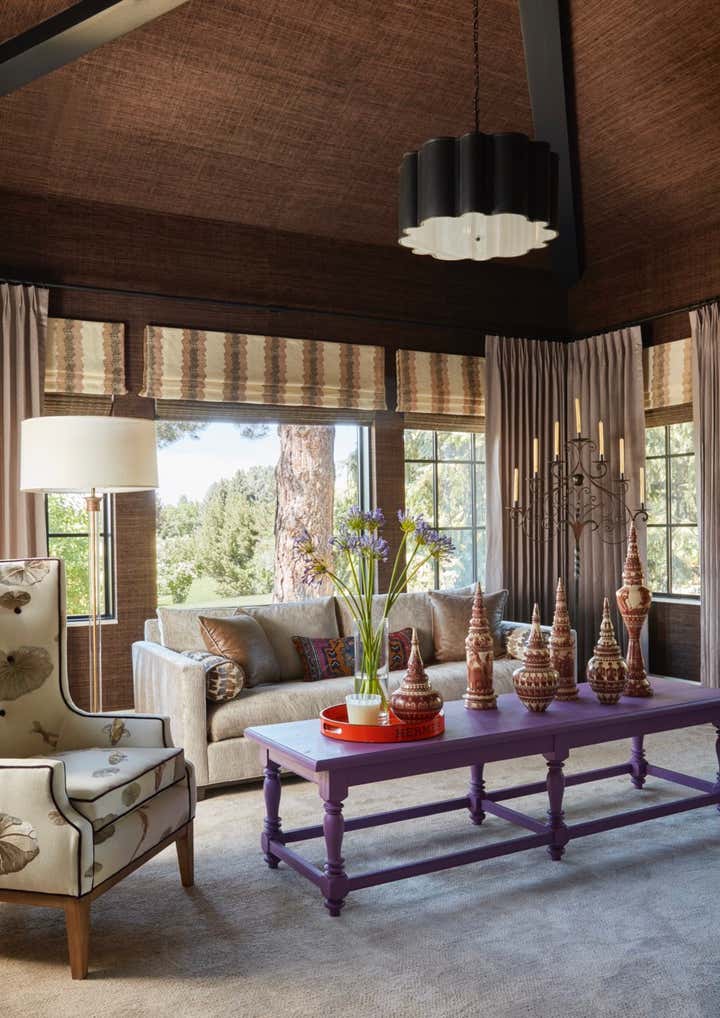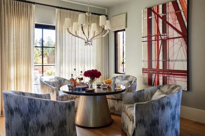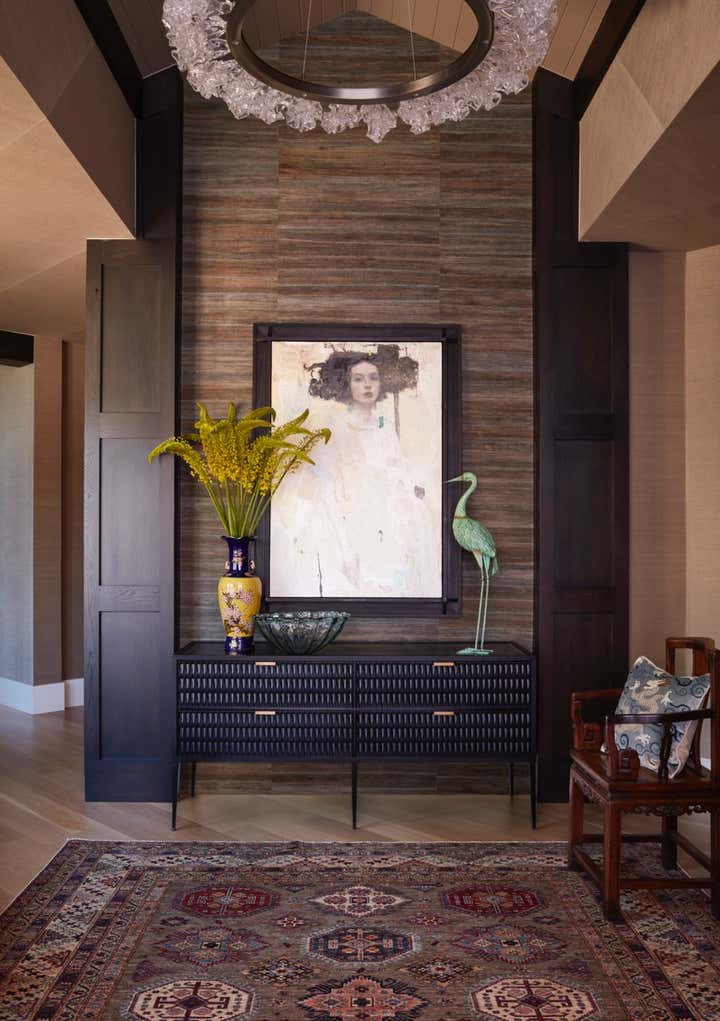 Cloaking almost every surface in a warm taupe grasscloth wallpaper created a warm atmosphere, while every item installed played a role in making this house a home. The light fixtures emphasize the incredible art collection by casting ethereal shadows while the blue rugs contrast the warmth of the wallcovering to create a tonal harmony.