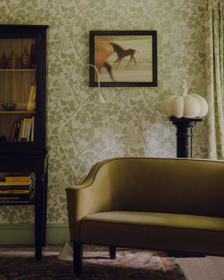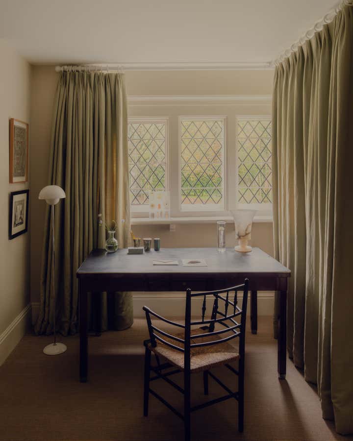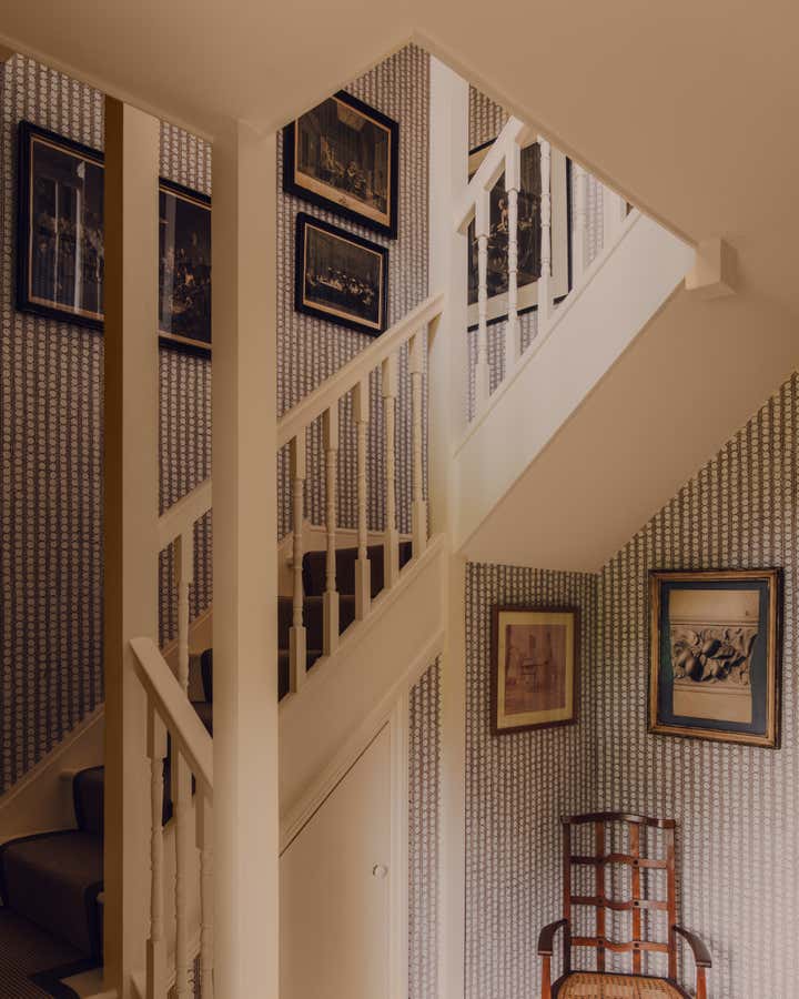 The exterior is full of fancy and detail - dragons on the roof, heraldic plaster plaques and planted-on gingerbread balconies hang off the outside. However, inside all is calm in the milky interiors lit by lead paned windows. The occupiers have used the house as a refuge from London for some time now, and the important paintings and drawings that they have researched and collected over the years - particularly ones of artists at their easels have sometimes come with them and found a home here.