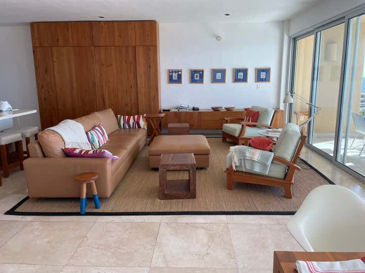 Beach vacation condo facing the aqua blue water and horizon. We designed and had the wooden furniture made in Mexico using indigenous woods and traditional carpentry methods. Colors are the bright colors of Mexico. This is a casual, relaxing space to get away for a few days.