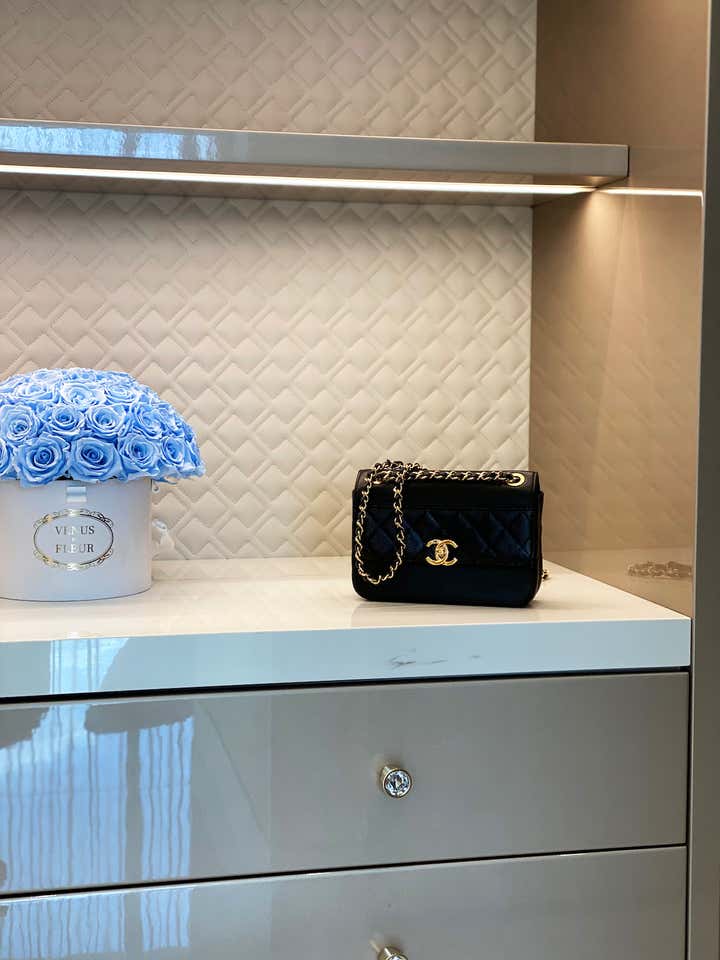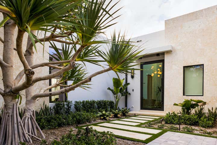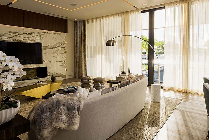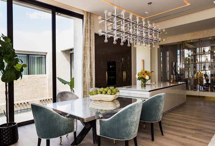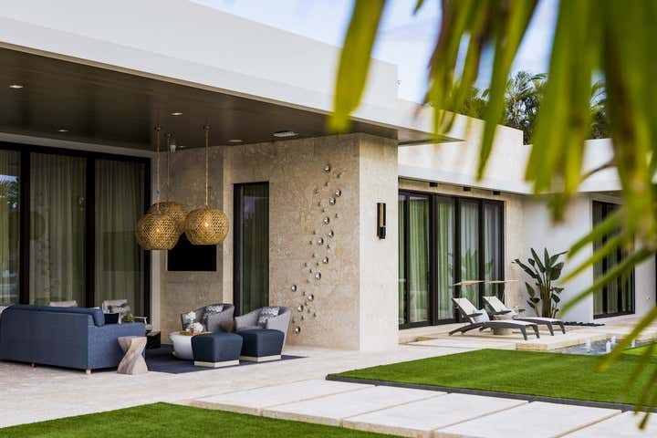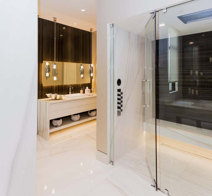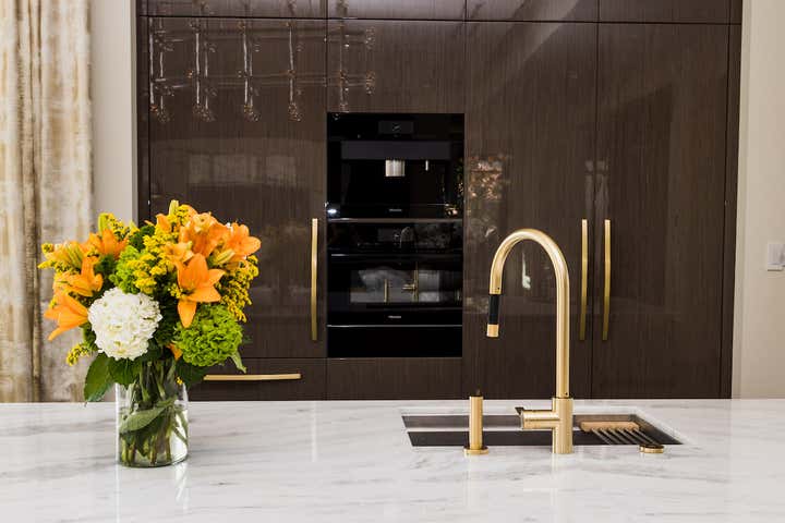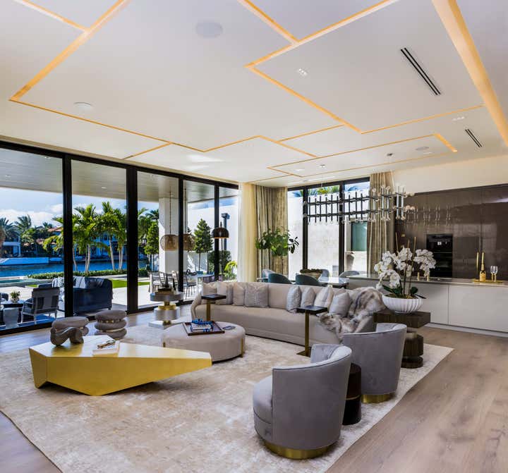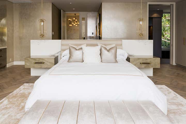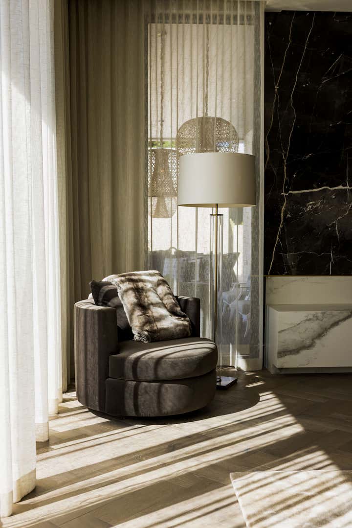An extension of their existing home next door, they wanted the feeling of a 5-star stay at home. With all of the high-end amenities of the Four Seasons, every detail captures the elevated vibe of a dreamy vacation, complete with a champagne wall and incredible knife-edge ceiling light, creating geometric shapes that resemble the Trafalgar Square by Piet Mondrian. Natural light streams through enormous glass doors, while reflecting ocean views. This house is elegantly inviting with luxe metals, natural stone, and an experience that celebrates a well-designed life.