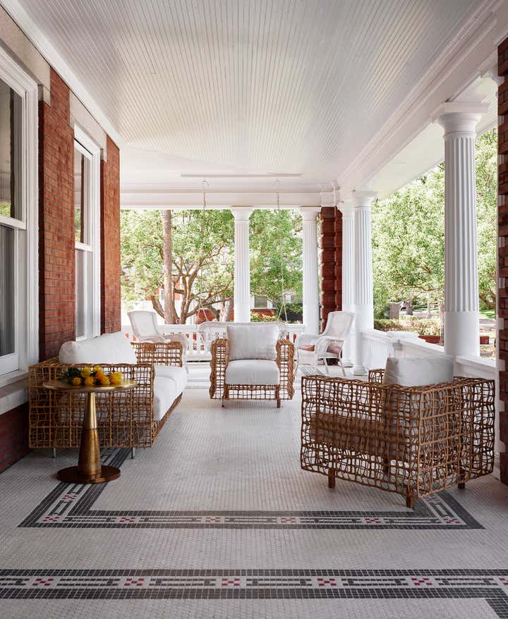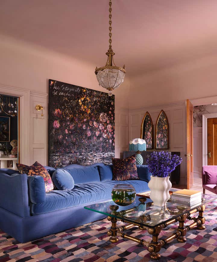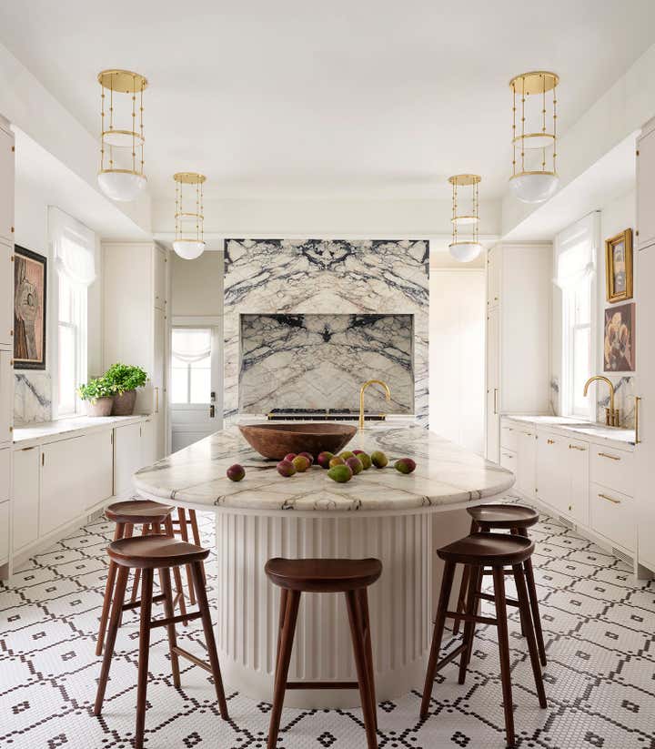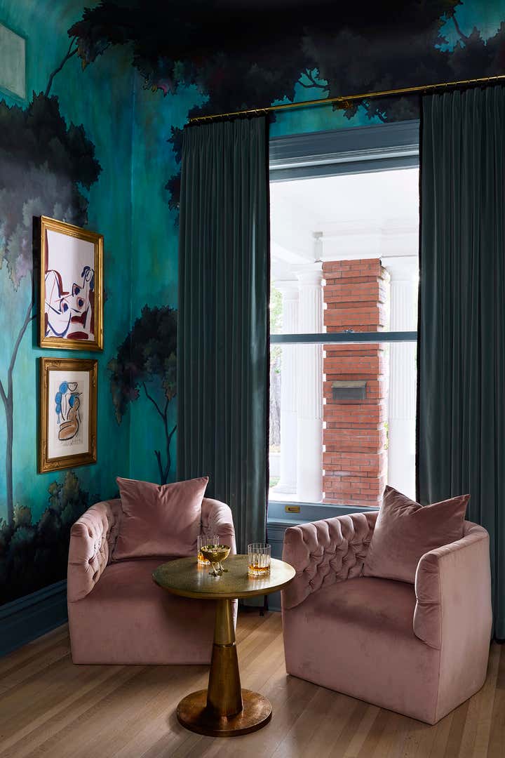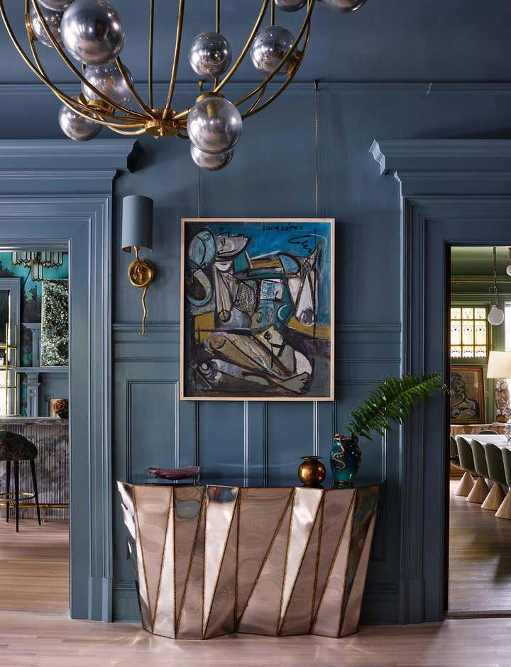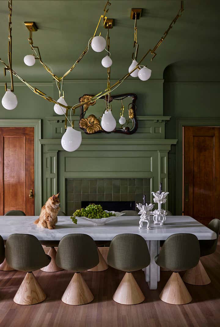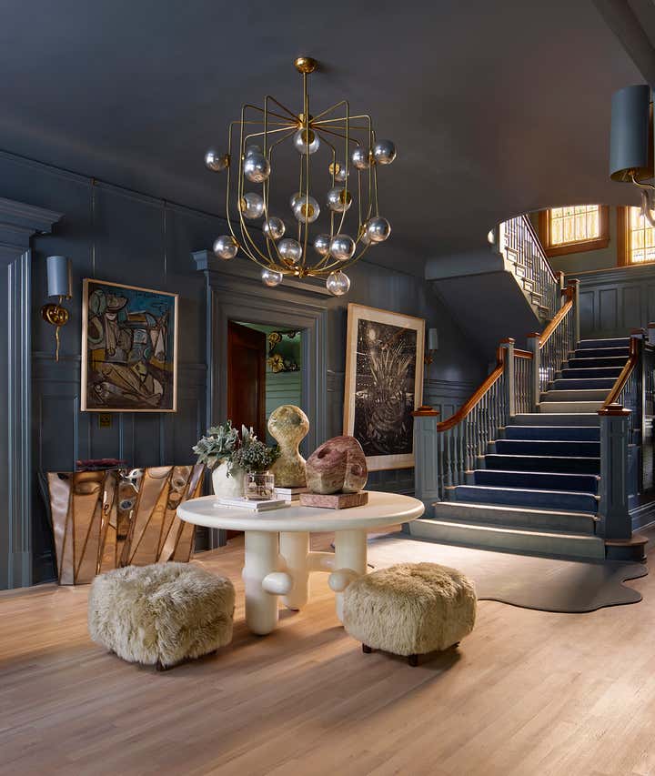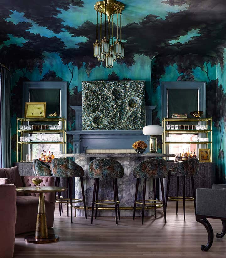 A 1910 residence was transformed into a moody, layered retreat inspired by the glamour of London’s grand hotels. Original stained-glass windows and eight historic fireplaces guided a palette of rich, dramatic hues, while contemporary touches kept the home fresh for a blended family of six. Gathering-focused spaces—like the hand-painted Bar Lounge with a fluted Calacatta Viola marble bar—invite both lively entertaining and quiet moments. The updated kitchen flows to a versatile breakfast room, while whimsical details enliven the kids’ third-floor retreat. The result is a home that balances tradition and innovation, honoring its past while embracing the present.