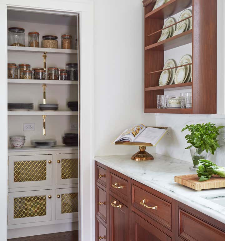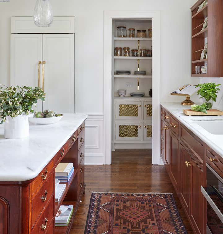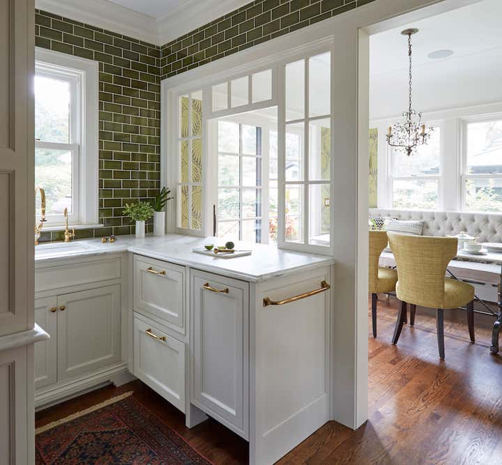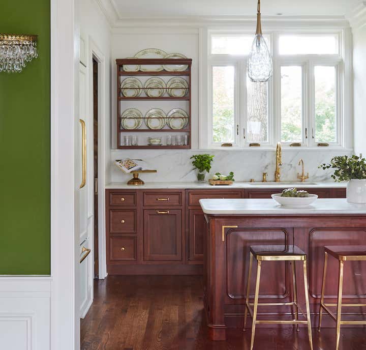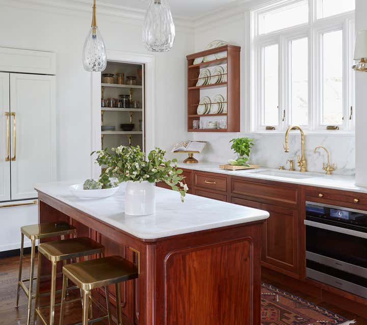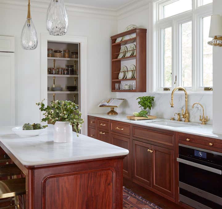 There was a lot of structural work that had to happen behind the scenes before we could achieve this classic English country style kitchen. The goal was to make the kitchen feel like the rest of the living space. The original breakfast room had terrible sliding patio doors, and an enormous radiator that took up a ton of space. The deep cove plaster ceiling awkwardly terminated into the 90’s kitchen renovation done by the previous owner. The back stairs to the basement and backyard were inside the house, but in an unconditioned space that had to completely re-worked. As with many KLI projects, there was so much more to re-design than just the kitchen! We designed a new deck and entry into the house while managing to keep the secondary stair to the basement – no easy feat with the headroom requirements. KLI specified new French doors and a window over the sink to exactly match the existing we replaced. When we finally got to the kitchen design, we found a salvaged mahogany bar at Architectural Artifacts and retrofitted it to become the island and used a custom stain on the walnut cabinets to achieve the perfect match. The homeowners desired a clean look with no upper cabinets so with a little creative space planning, we closed up a door to the hallway, and carved out space for an amazing walk-in pantry with a pocket door. he butler’s pantry space was designed as a transition between the kitchen and breakfast room, but we wanted to keep it light and open, so used windows instead of walls, almost like an interior vestibule. Custom cabinetry, finishes and fixtures provided by KLI.