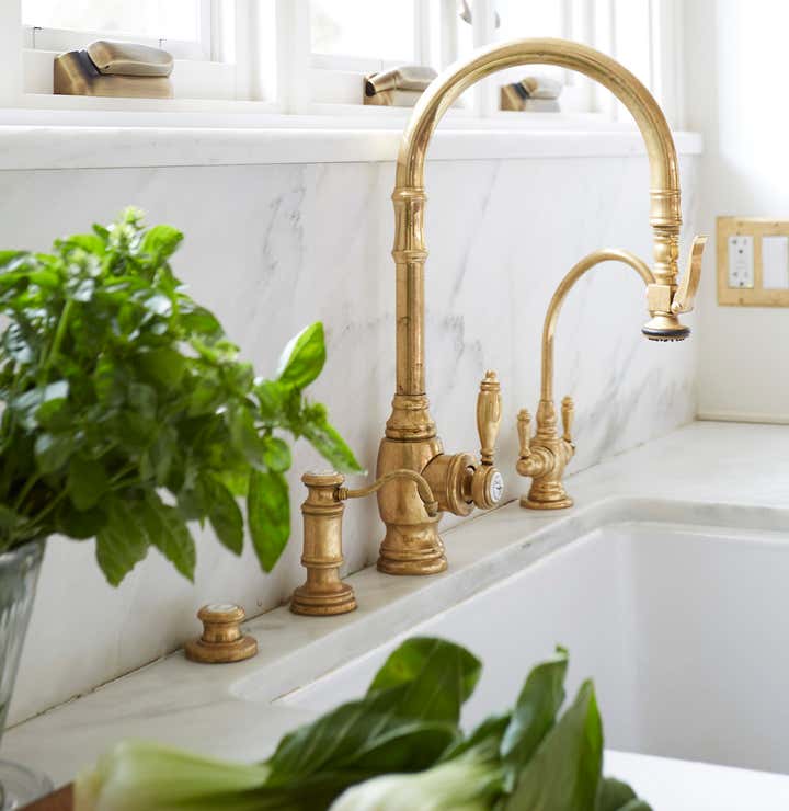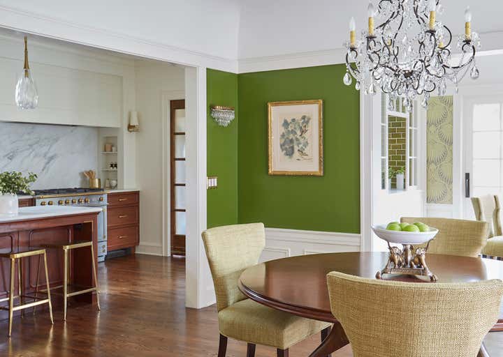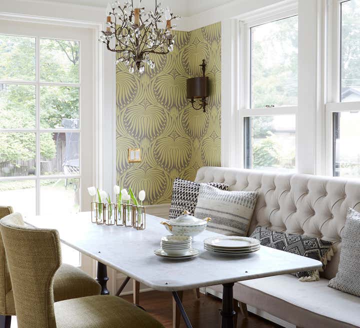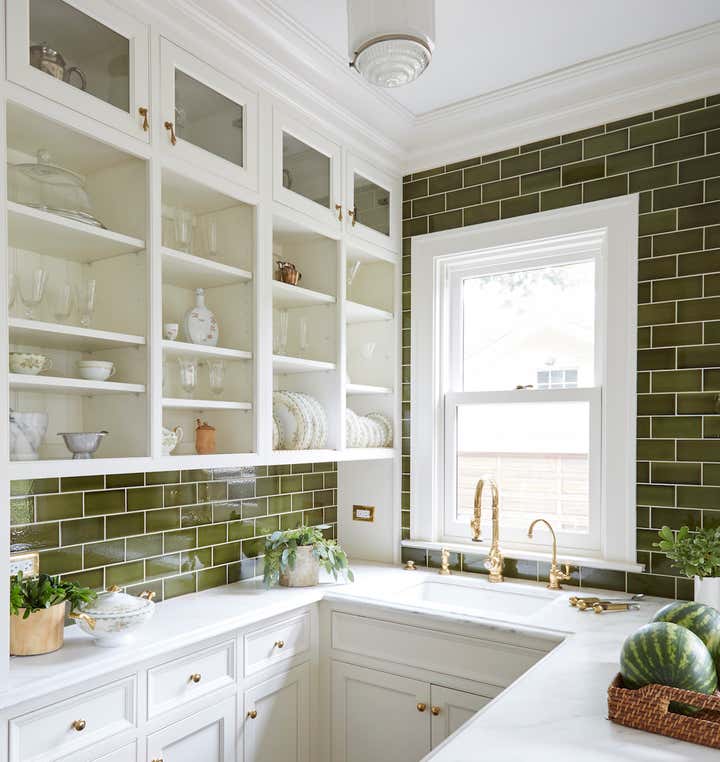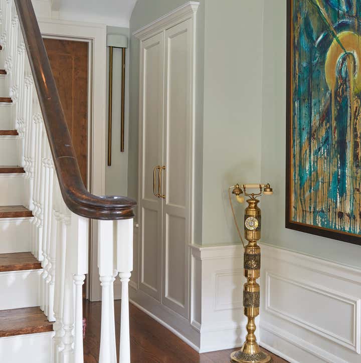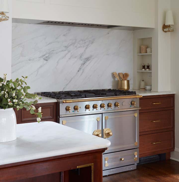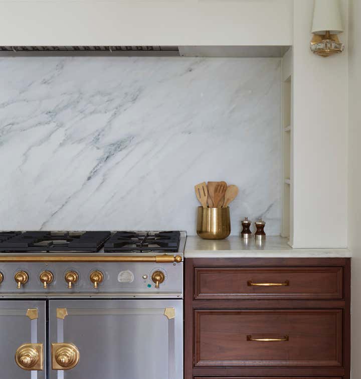 There was a lot of structural work that had to happen behind the scenes before we could achieve this classic English country style kitchen. The goal was to make the kitchen feel like the rest of the living space. The original breakfast room had terrible sliding patio doors, and an enormous radiator that took up a ton of space. The deep cove plaster ceiling awkwardly terminated into the 90’s kitchen renovation done by the previous owner. The back stairs to the basement and backyard were inside the house, but in an unconditioned space that had to completely re-worked. As with many KLI projects, there was so much more to re-design than just the kitchen! We designed a new deck and entry into the house while managing to keep the secondary stair to the basement – no easy feat with the headroom requirements. KLI specified new French doors and a window over the sink to exactly match the existing we replaced. When we finally got to the kitchen design, we found a salvaged mahogany bar at Architectural Artifacts and retrofitted it to become the island and used a custom stain on the walnut cabinets to achieve the perfect match. The homeowners desired a clean look with no upper cabinets so with a little creative space planning, we closed up a door to the hallway, and carved out space for an amazing walk-in pantry with a pocket door. he butler’s pantry space was designed as a transition between the kitchen and breakfast room, but we wanted to keep it light and open, so used windows instead of walls, almost like an interior vestibule. Custom cabinetry, finishes and fixtures provided by KLI.