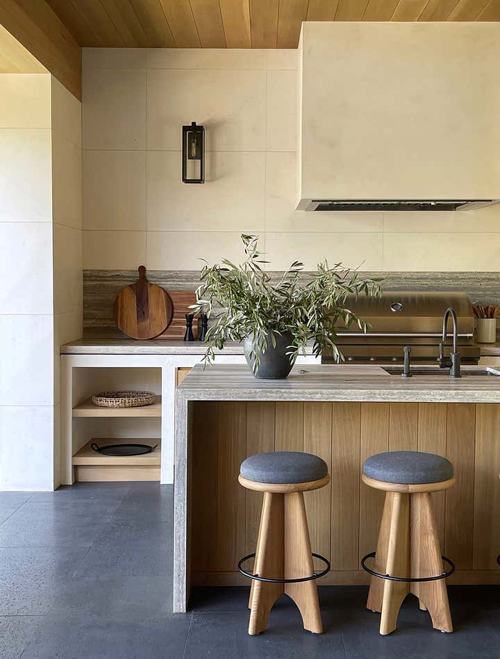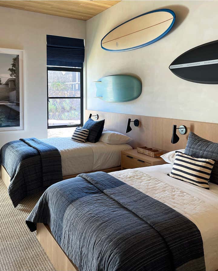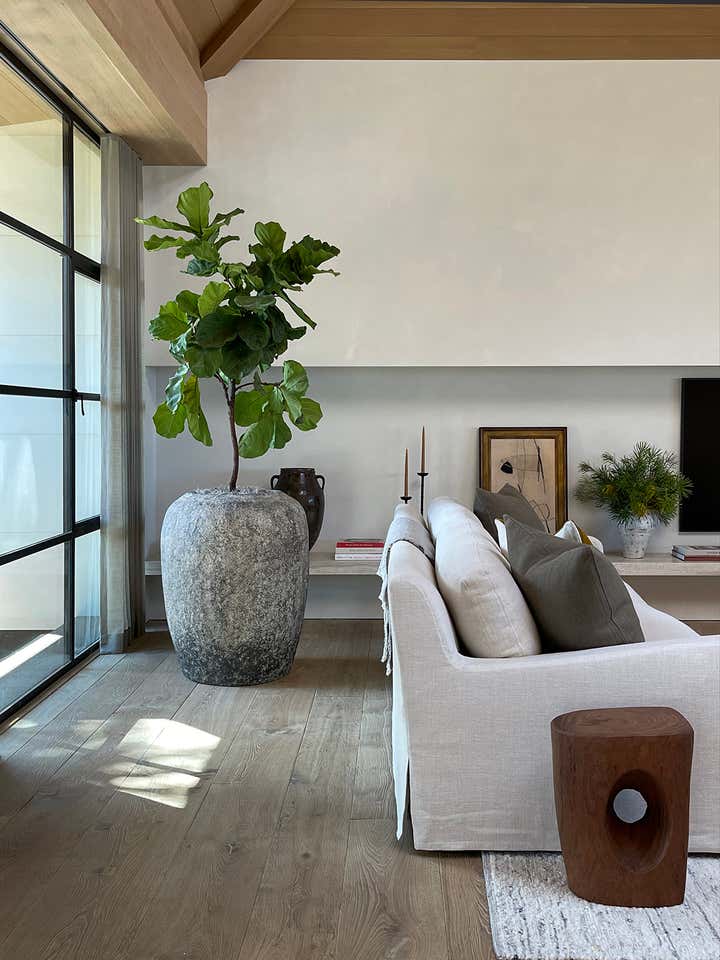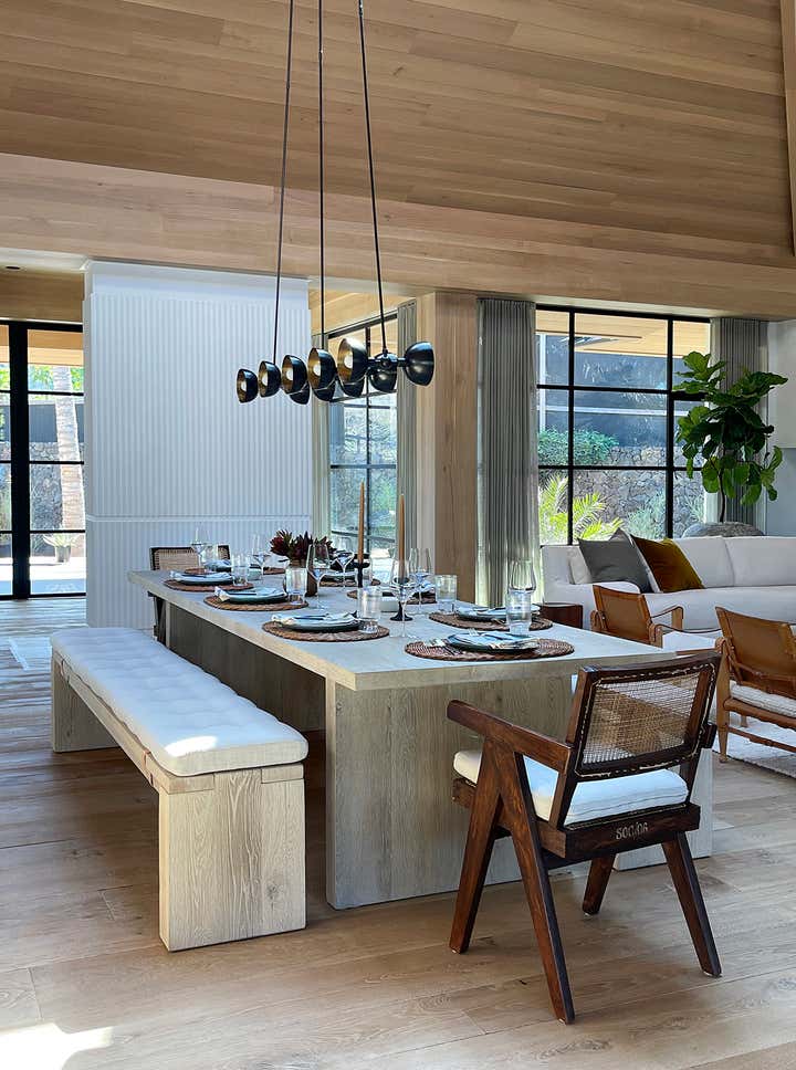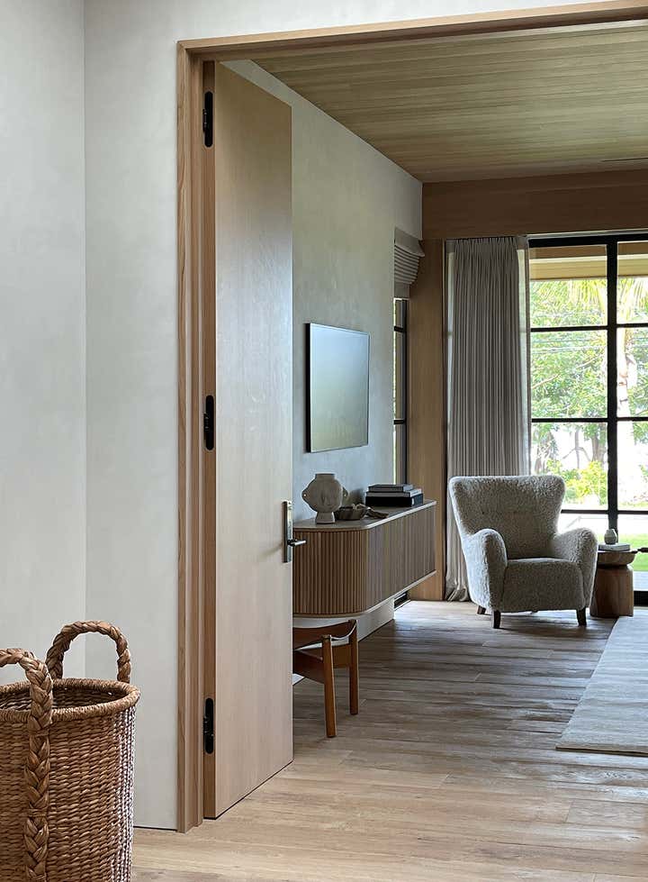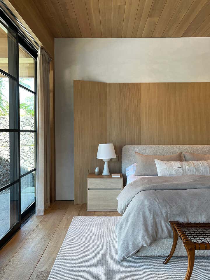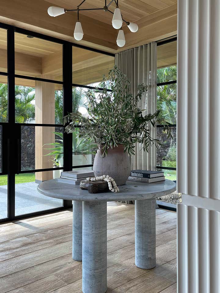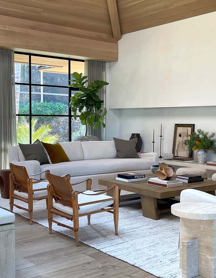 The homeowners asked designer Nam Dang-Mitchell to create airy, serene interiors that would promote a lifestyle best described as barefoot living. Inside, it feels breezy and laid-back, thanks to the plaster walls and wood-clad ceilings that add understated warmth. A material mix of stone, soft linens, woven fabrics and unfussy slipcovers is beachy yet sophisticated. The thoughtful, eclectic mix of vintage and new furniture and accessories also reflects the client's discerning style.