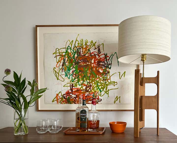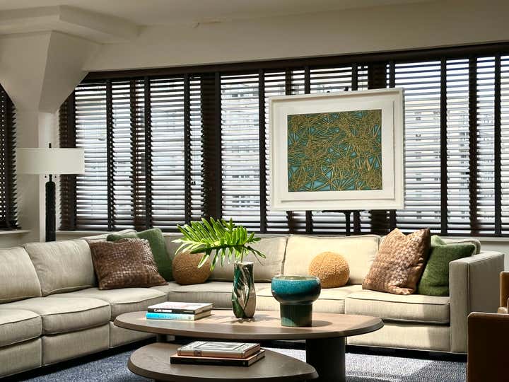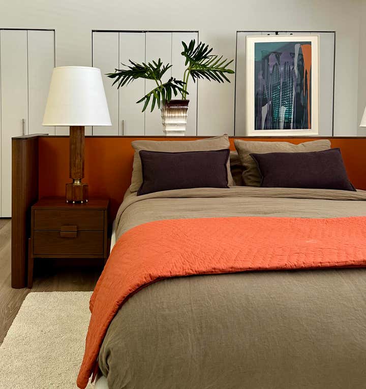 Clean-lined silhouettes and rich warm color palette help to ground the apartment