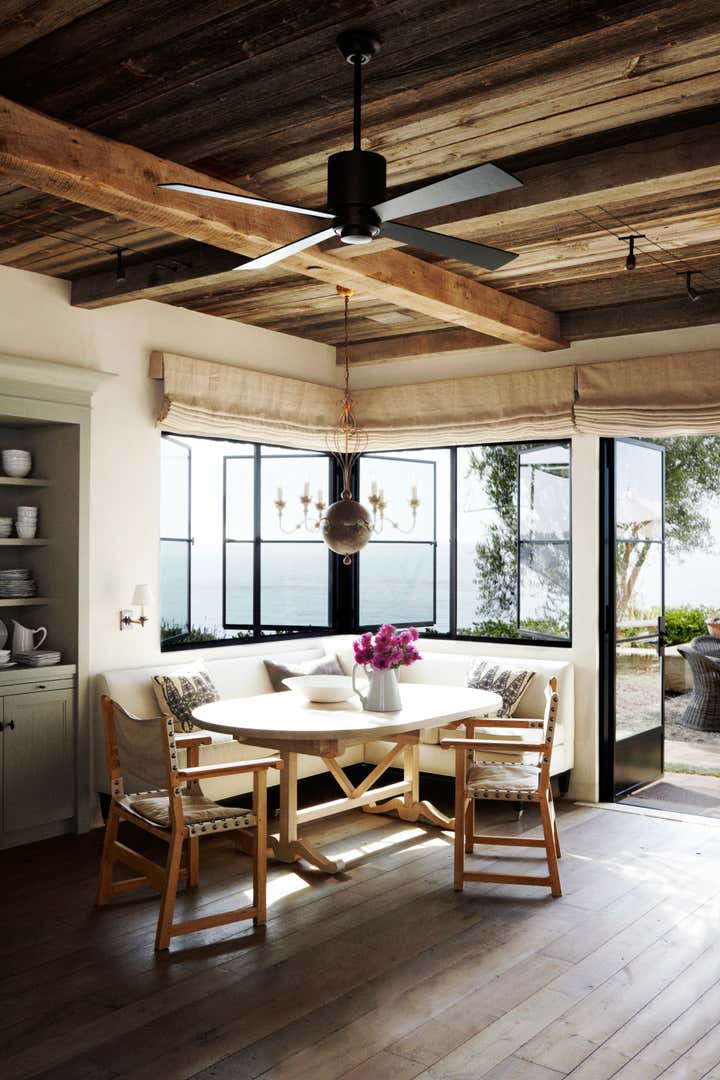 This one story, idyllic beach home is perched overlooking the Pacific Ocean. The home hugs the coastline inviting breathtaking views through steel and glass doors and windows. Plaster walls reflect the bright coastal light and wash the palette of blues, greys and creamy whites. The residence is a study in sophisticated luxury and casual elegance with a balance of Swedish and Belgian antiques paired with slipcovered furniture and abaca rugs.