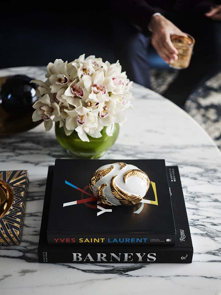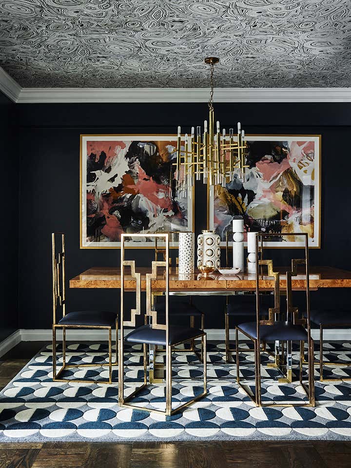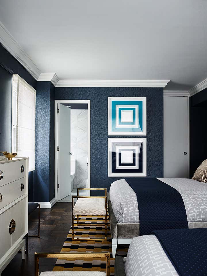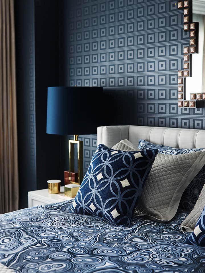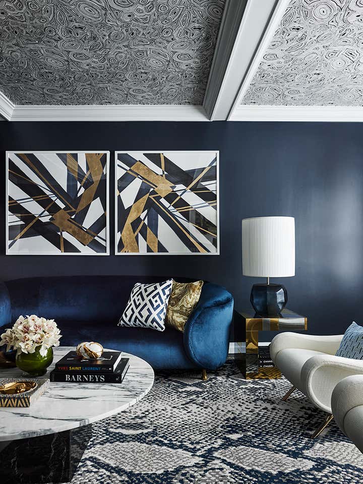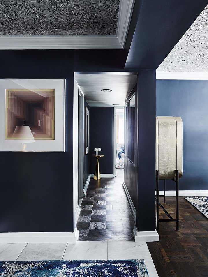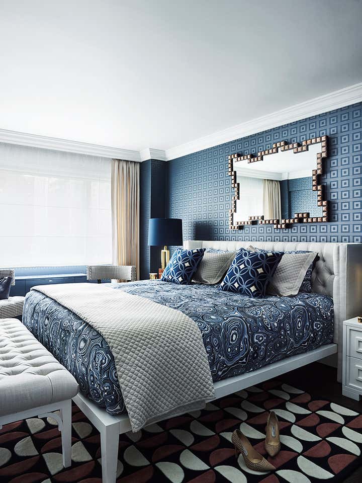 Chic navy blue is a defining element of the design, inspired by one of Greg Natale’s patterned wallpapers, which the client admired. The colour scheme evolved from there, with the wallpaper appearing in the master bedroom and navy-painted walls becoming a highlight of the entrance and living areas.