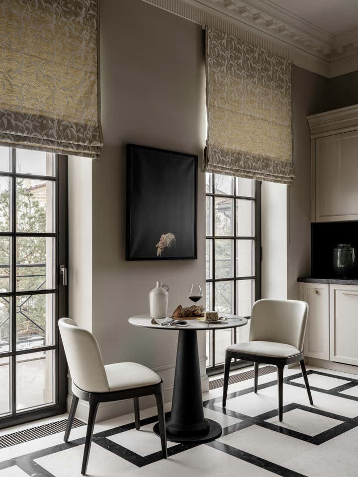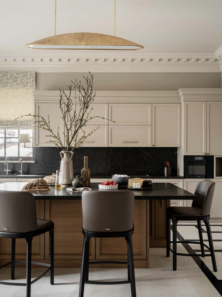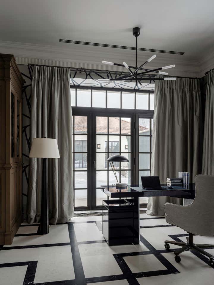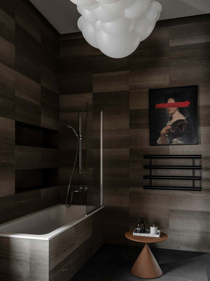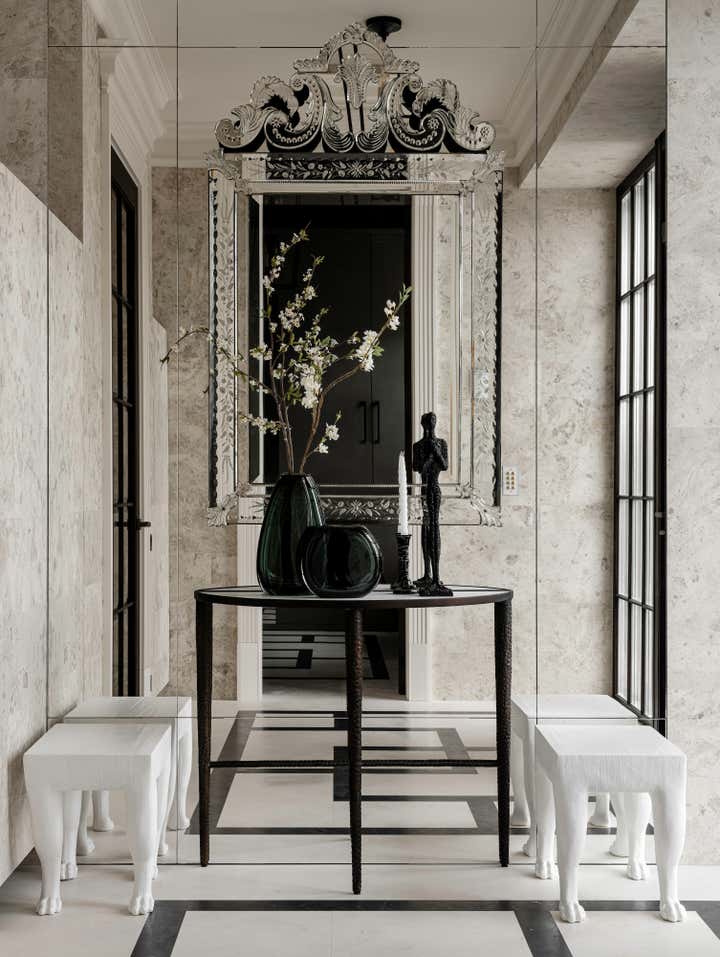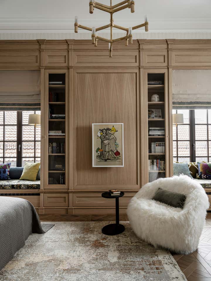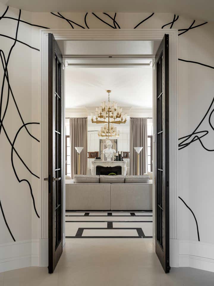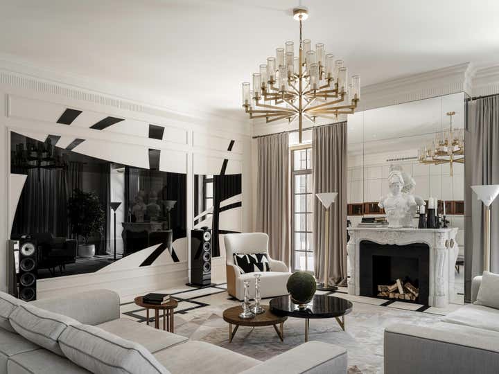 We designed a spacious oval entrance hall with a vaulted ceiling, a main staircase and walls painted by avant-garde street artists. That called for the dismantling of a major part of the slab. We nested a TV set in a graphic panel made of black glass – that was the first time we used this design trick. The black glass panel itself is an art object that works perfectly well in juxtaposition with the antique white marble fireplace mantel across the room. Opulent textures and an elaborate colour scheme with accented black, white and gold dominate the interior and create a solid spatial pattern.