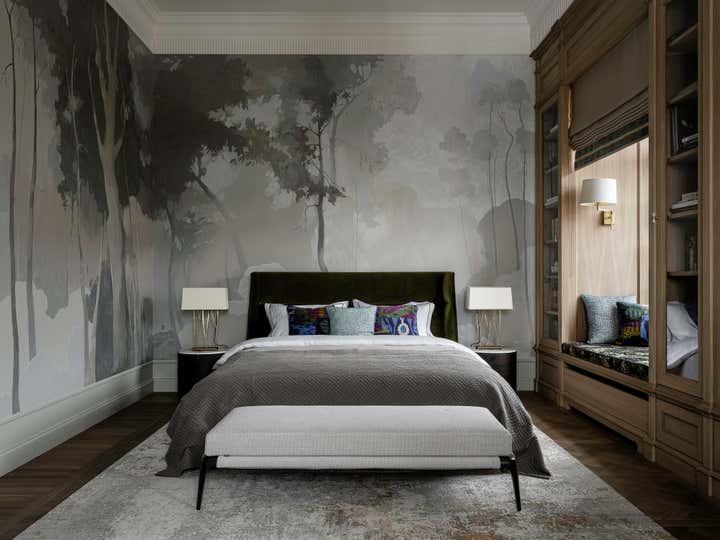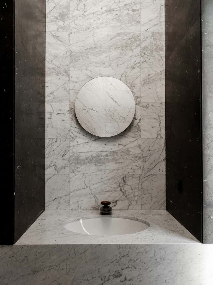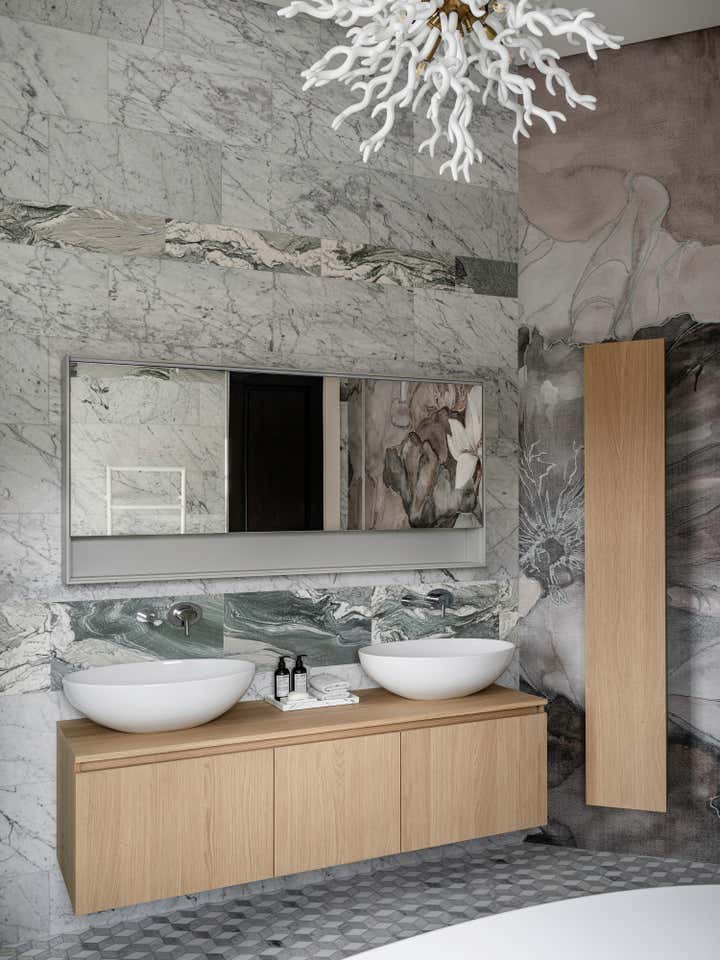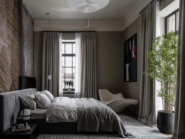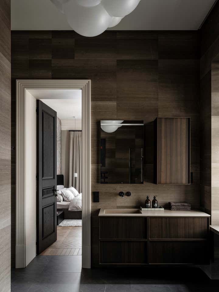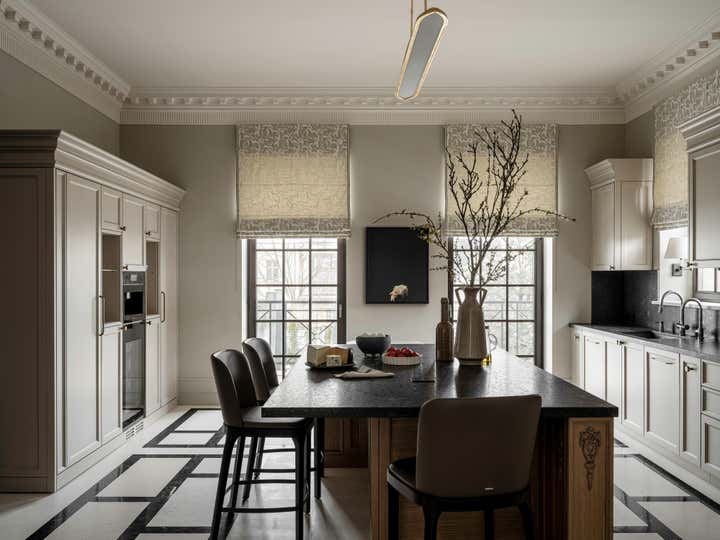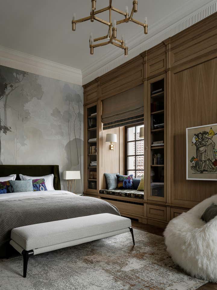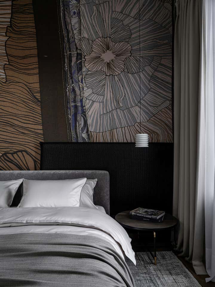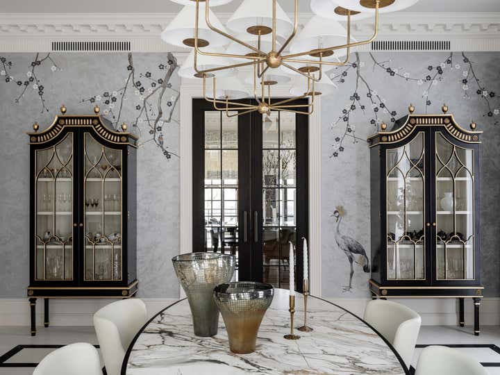 We designed a spacious oval entrance hall with a vaulted ceiling, a main staircase and walls painted by avant-garde street artists. That called for the dismantling of a major part of the slab. We nested a TV set in a graphic panel made of black glass – that was the first time we used this design trick. The black glass panel itself is an art object that works perfectly well in juxtaposition with the antique white marble fireplace mantel across the room. Opulent textures and an elaborate colour scheme with accented black, white and gold dominate the interior and create a solid spatial pattern.