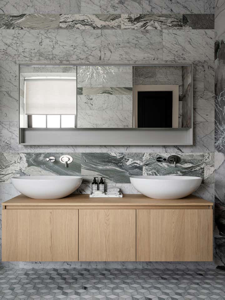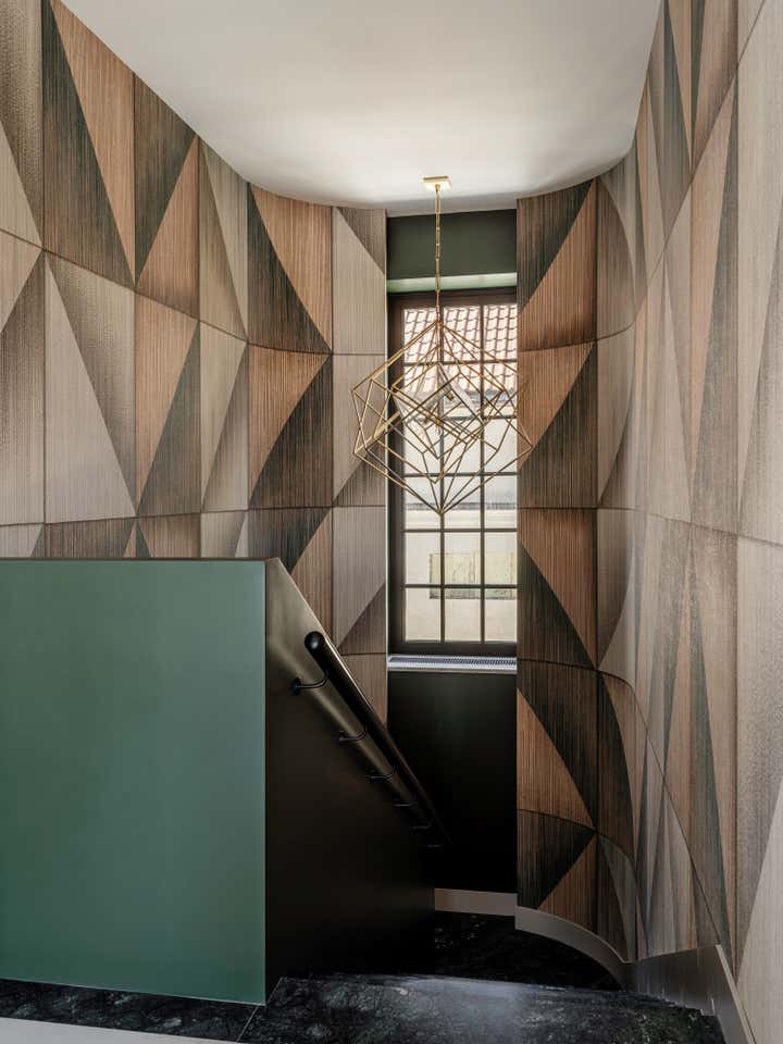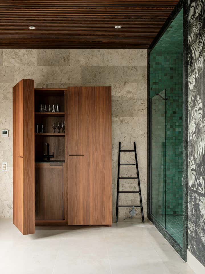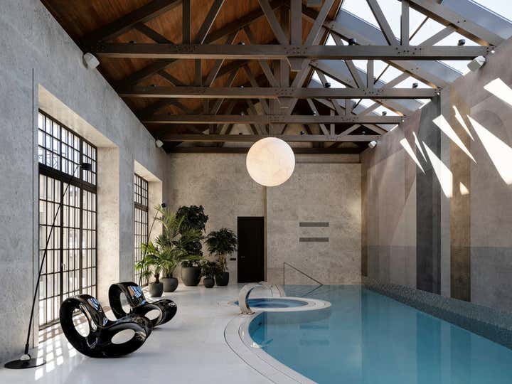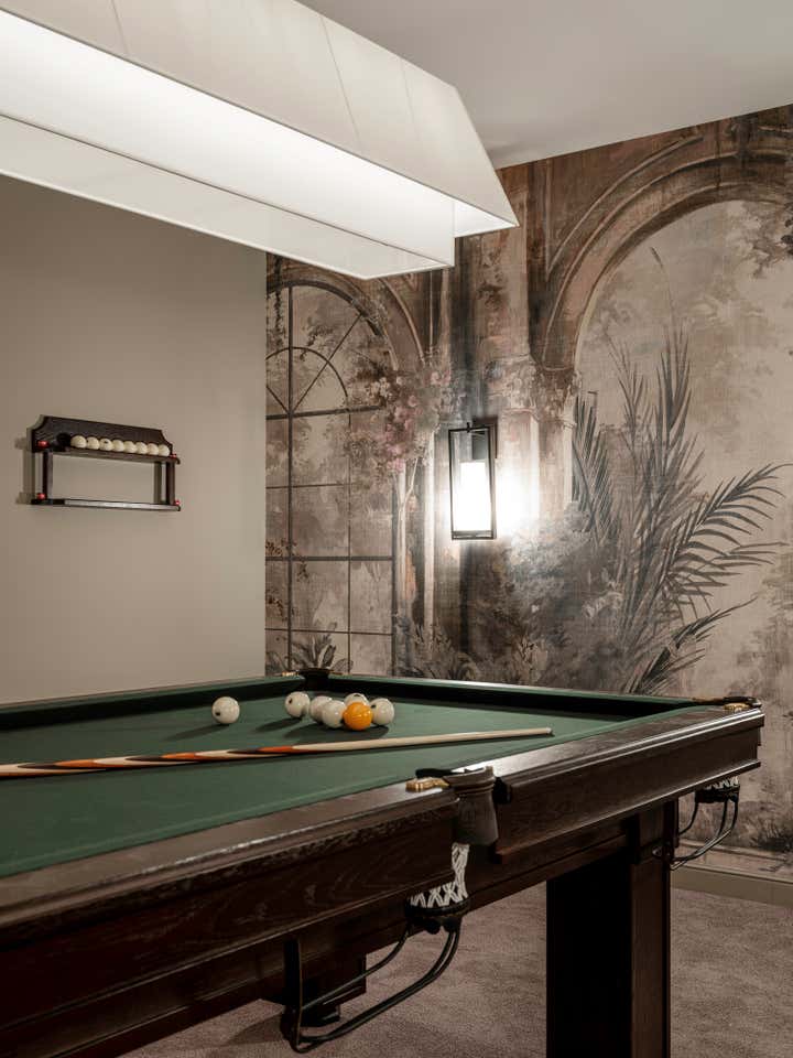We decorated one of the walls in the pool area with water-resistant wallpaper, a graphic panel and a glass mosaic which reflects the water in the pool. A glass ceiling and wood ceiling beams create fantastic geometrical effects of light and shade on a sunny day.