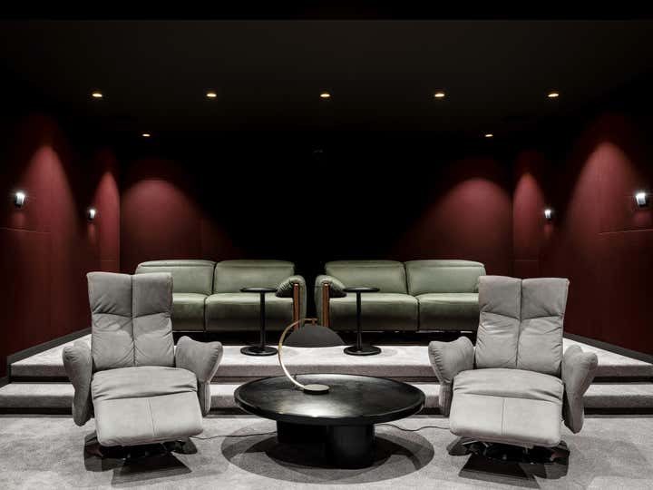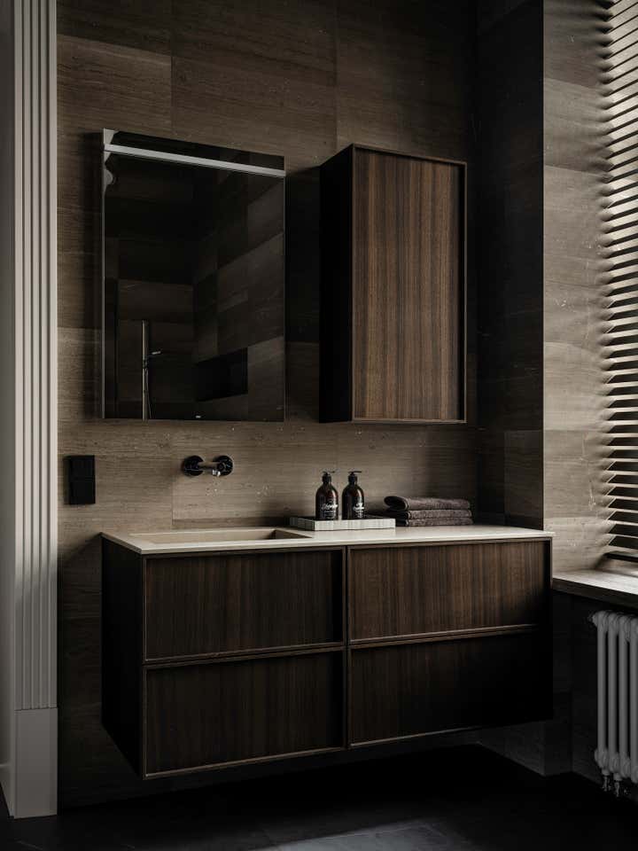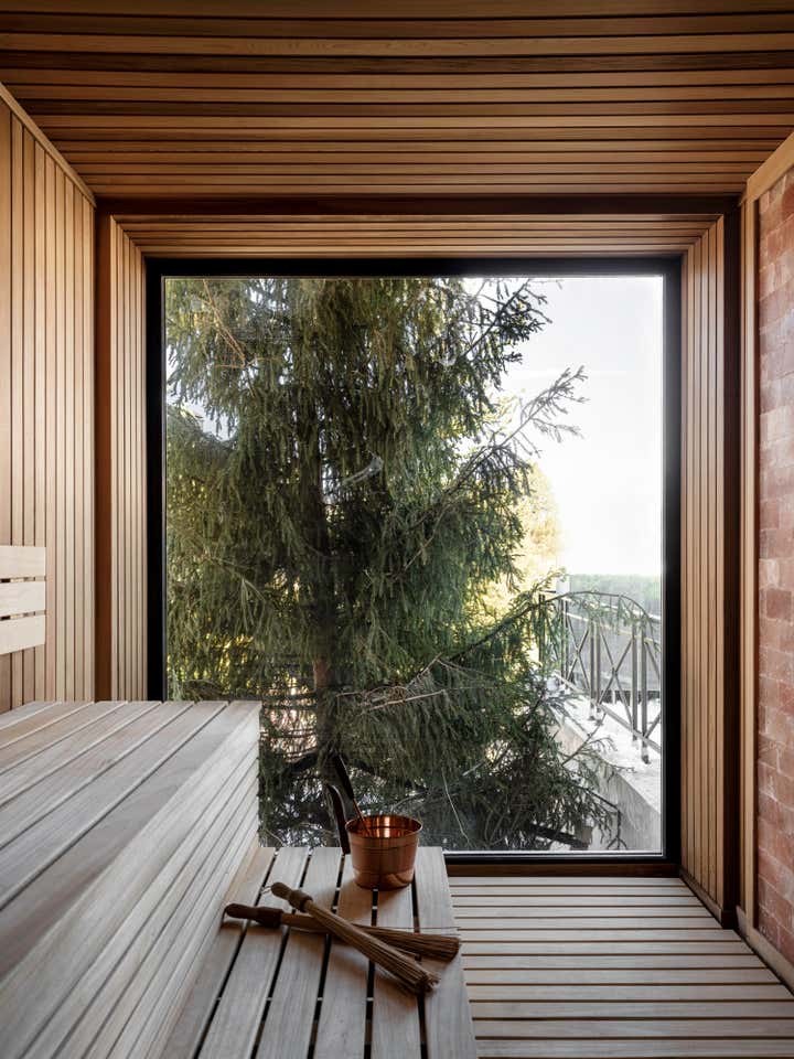 The scope of work was colossal! Initially, the house had a total area of 750 square meters, which we doubled by building balconies and a linked house with a spa area. A heated underground passage lets you move to the spa area and stay comfortable even when it is cold outside. We had to move the columns apart in the main house in order to enlarge a tiny door behind them into an adequate entrance unit. It helped us offset the excessive height of the basement level and make the house look balanced.