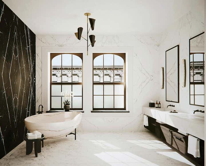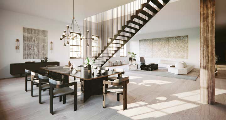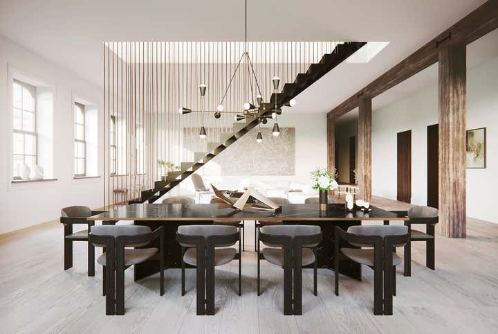 The NYC Loft is a Lower Manhattan pied-a-terre for West Coast clients with an extremely busy bicoastal lifestyle. An extensive renovation was required to remove an odd assembly of spaces and to utilize the full potential of the apartment in order to create a highly customized residence, that would serve both as calm and airy space to come home to after a hectic day or a versatile private space to entertain friends and guests in the great room or on the private rooftop. The great room spans over almost half of the floor area and offers a seamless open living concept between the living and dining area as well as the kitchen. A generous master suite is located on the opposite end of the apartment, which is buffered by two further spacious bedrooms, each bedroom with its own en-suite and dressing room, as well as secondary spaces. The client’s initial informal brief for the interiors contained a total of four words: ‘Open space. Contemporary. Serene.’ Responding to the client’s request and vision for the property, the focus of the understated contemporary design concept turned towards material character and texture rather than strong patterns or statement colors. Whether it is the beautifully aged finish of an original wood beam, the large planks of cerused European oak flooring, the haptic experience of a custom soft silk rug or the unique veining of a feature stone, carefully selected finishes and design elements form a layered composition of light colored materials structured by dark accents and highlighted by the occasional hint of warm brass tones. One of the design highlights is a slender blackened steel staircase leading up to the private rooftop. Initially perceived as a spatial challenge, as the access to the roof had to remain quite prominently in the center of the space, the stair was turned into a feature element, acting as a screen between the dining and living area. Merging necessity and design aided to subtly define the large space of the great room.