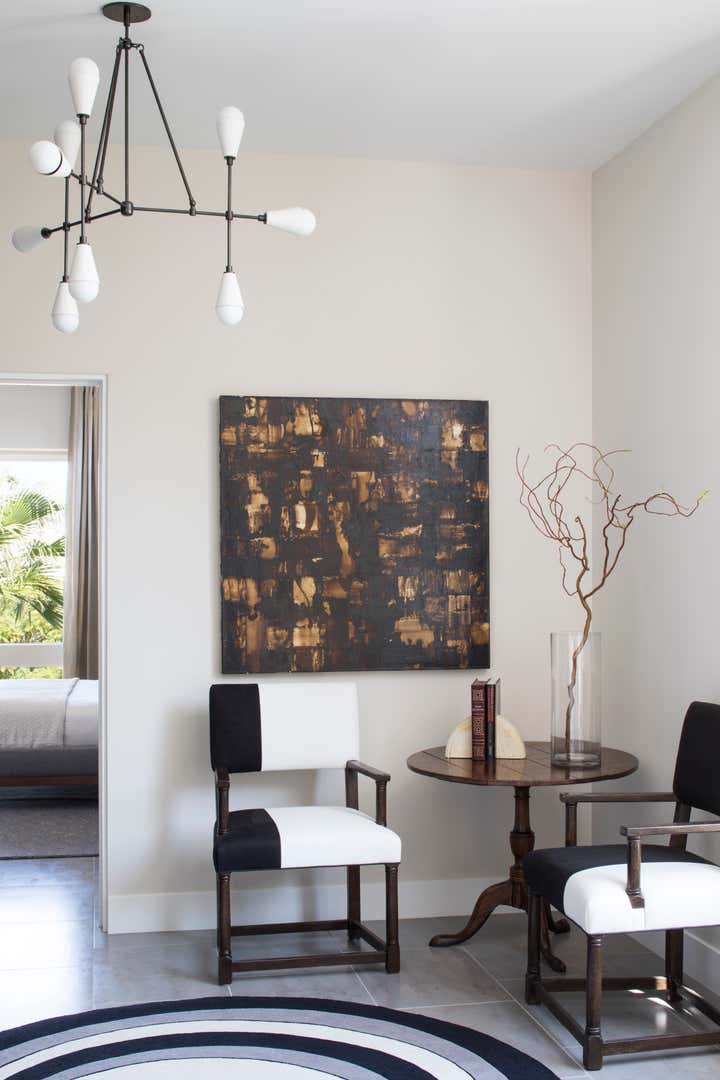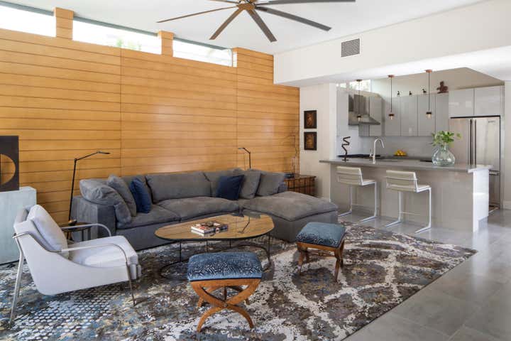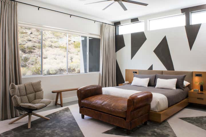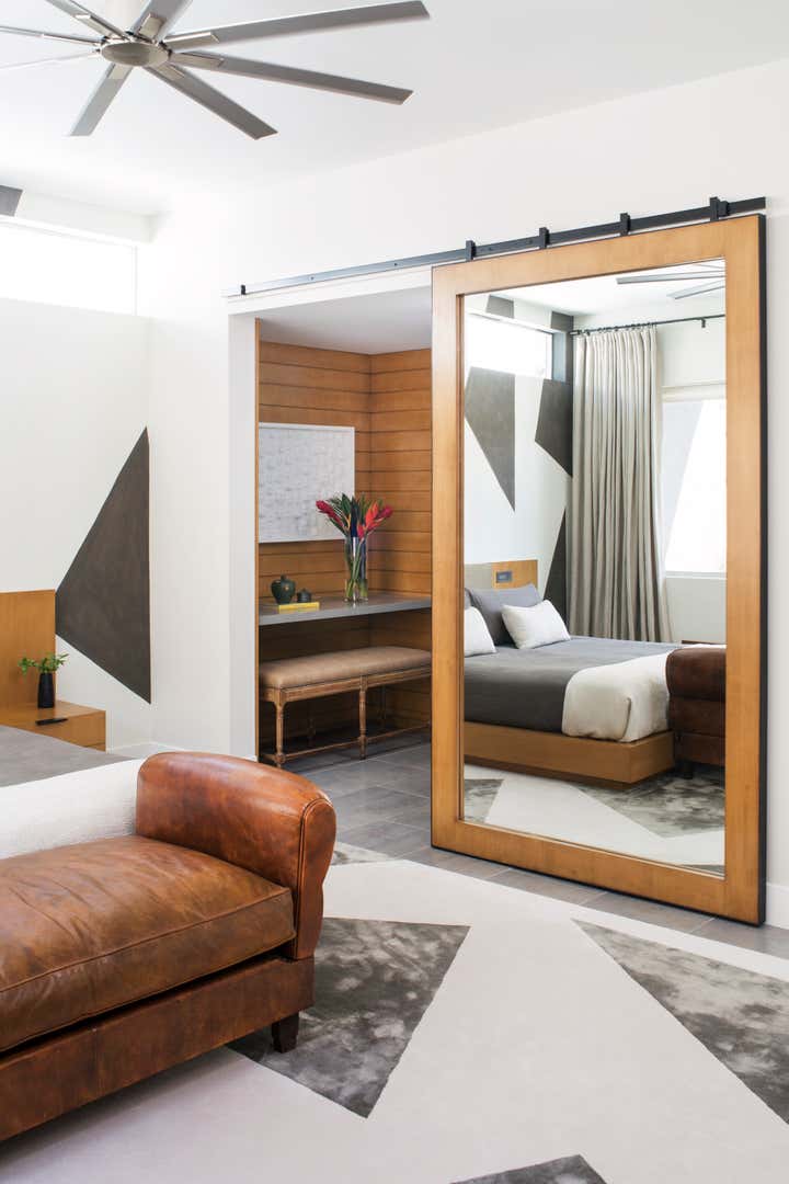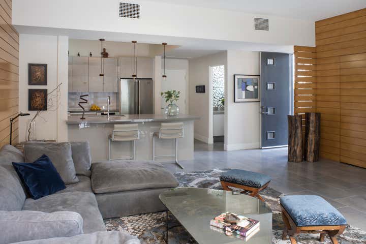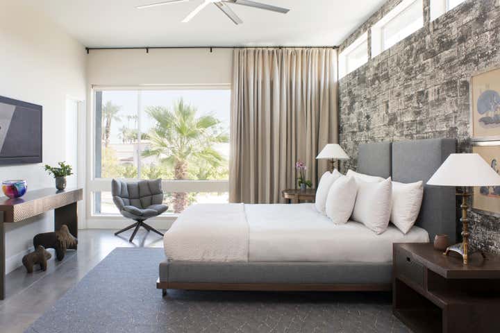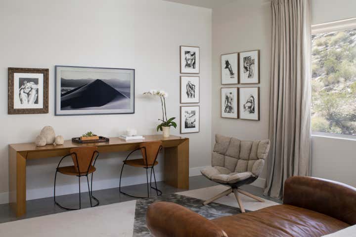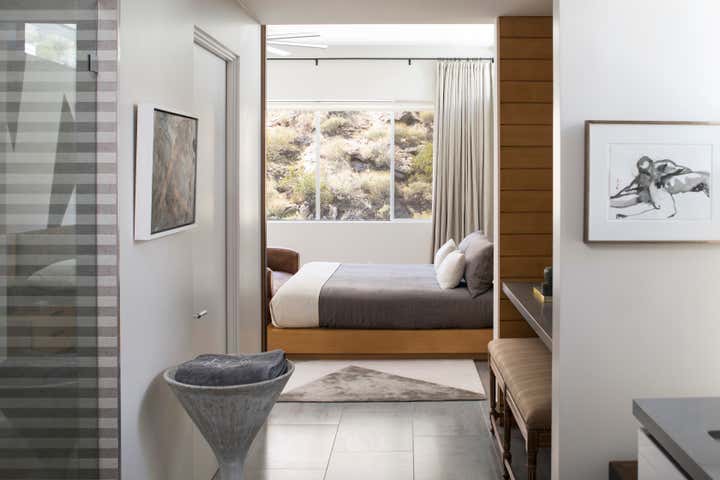 This contemporary vacation home that defies expectations of the mid-century desert aesthetic. Offering a departure from the traditional Palm Springs style, the home’s neutral- toned palette, inspired by the emerging landscape, serves as the cohesive backdrop for the client’s art and antiques, which spanned multiple styles and genres. Roberts achieved this by both countering and magnifying the style of select pieces in each space. More traditional elements like shiplap walls, distressed leather and a custom barn door complement the collection while maintaining a serene setting. The plumbing, surfacing and lighting was updated entirely throughout, elevating the home’s original design.