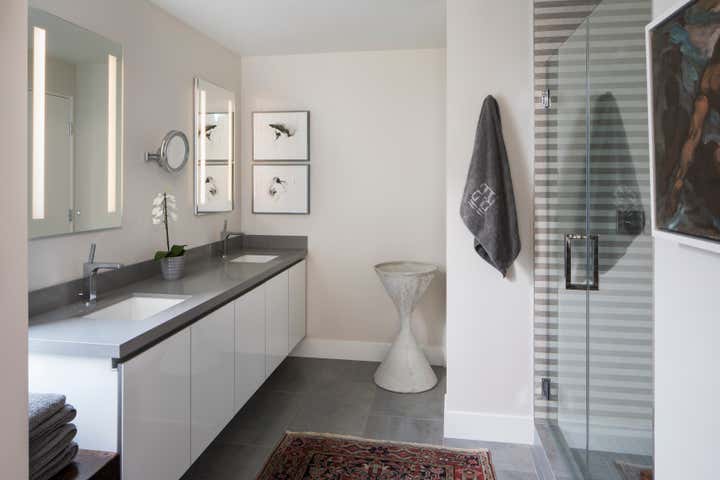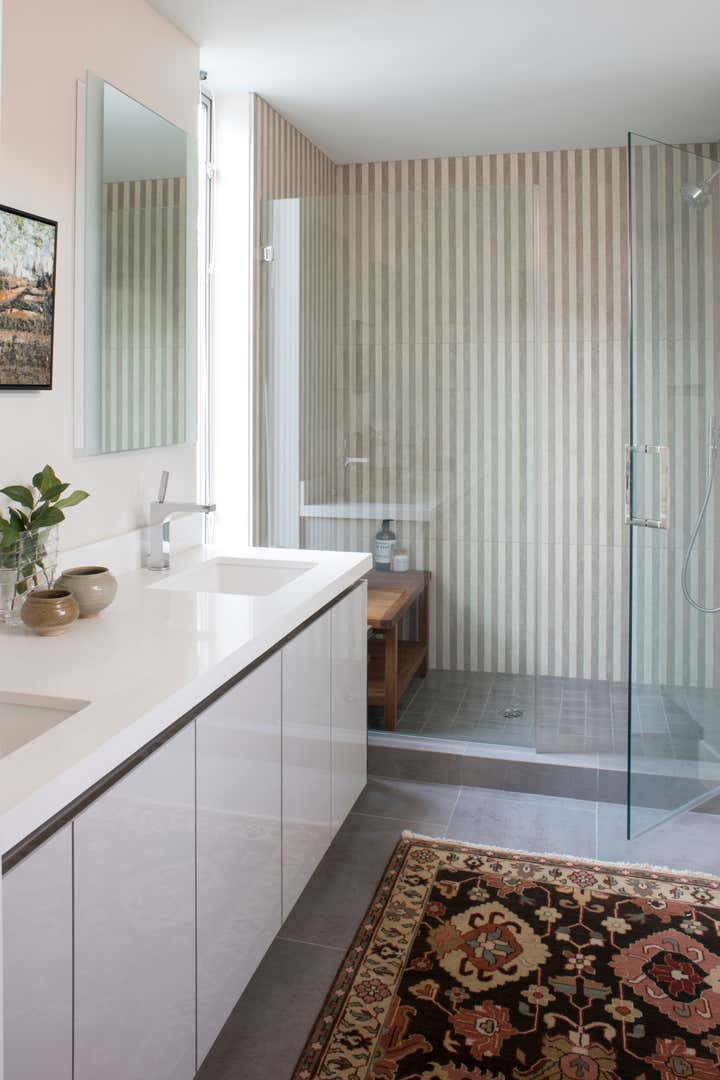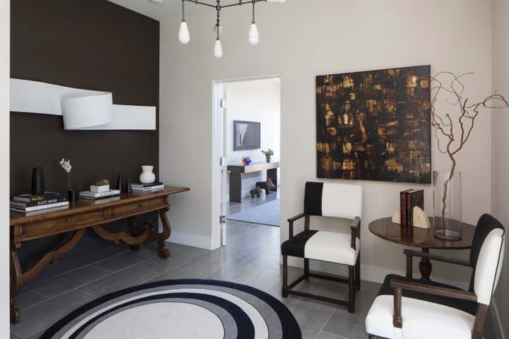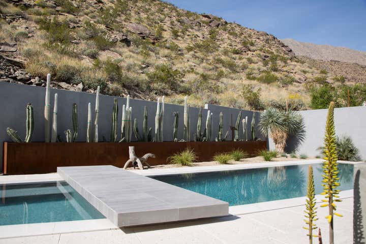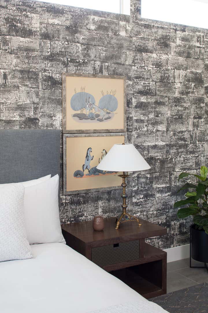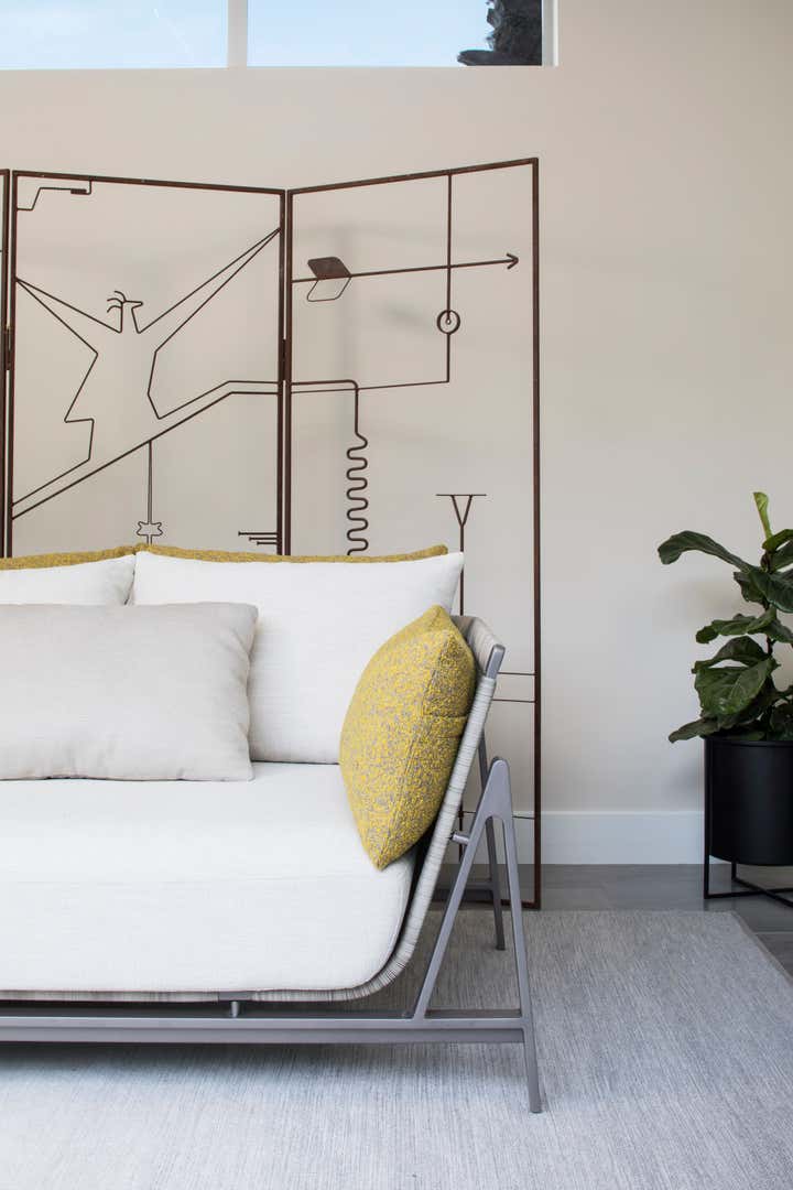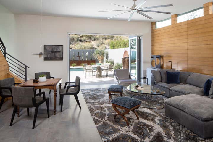 This contemporary vacation home that defies expectations of the mid-century desert aesthetic. Offering a departure from the traditional Palm Springs style, the home’s neutral- toned palette, inspired by the emerging landscape, serves as the cohesive backdrop for the client’s art and antiques, which spanned multiple styles and genres. Roberts achieved this by both countering and magnifying the style of select pieces in each space. More traditional elements like shiplap walls, distressed leather and a custom barn door complement the collection while maintaining a serene setting. The plumbing, surfacing and lighting was updated entirely throughout, elevating the home’s original design.