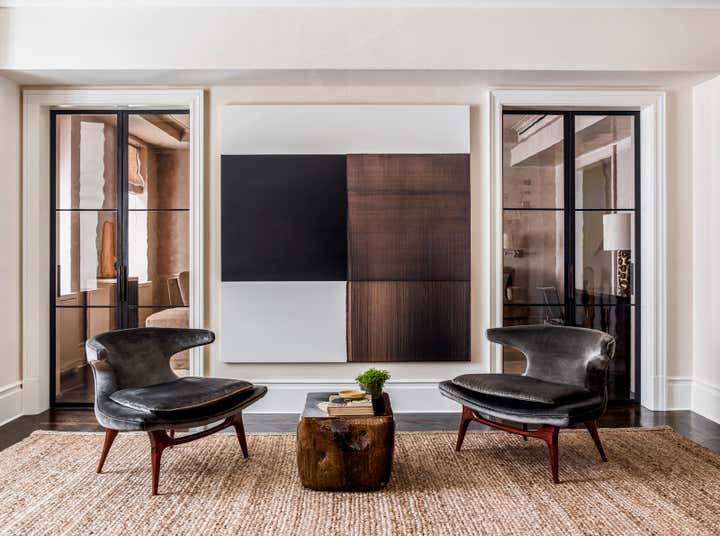 An extensive renovation which included a new kitchen and bathrooms, custom millwork and lighting, and the installation of historically accurate casement windows with energy-efficient glass, encased in blackened steel frames.