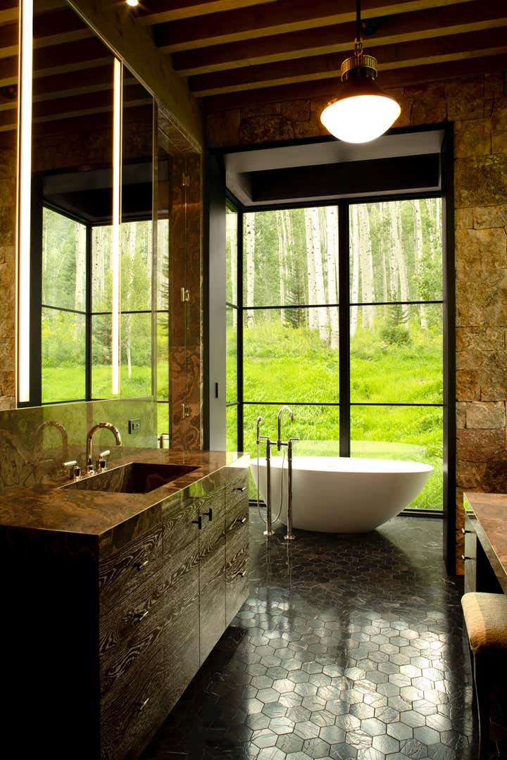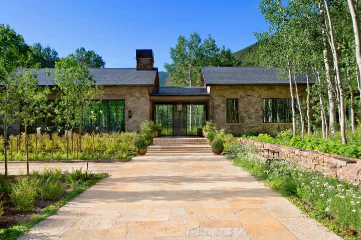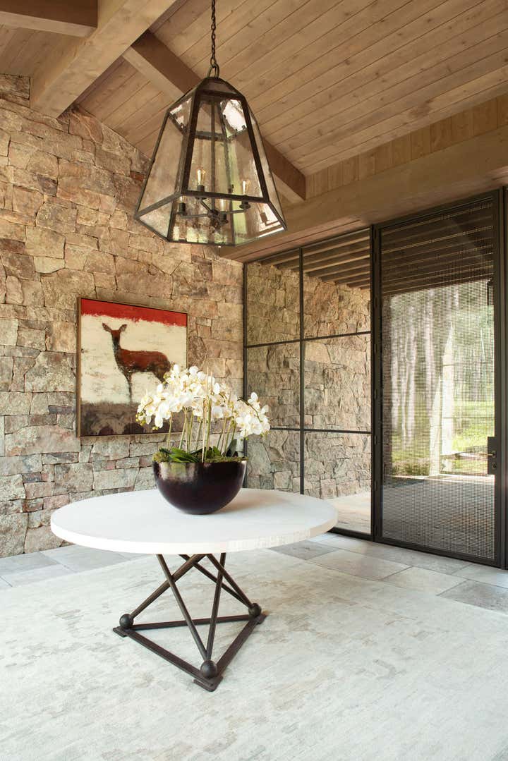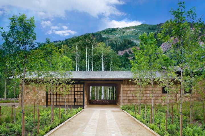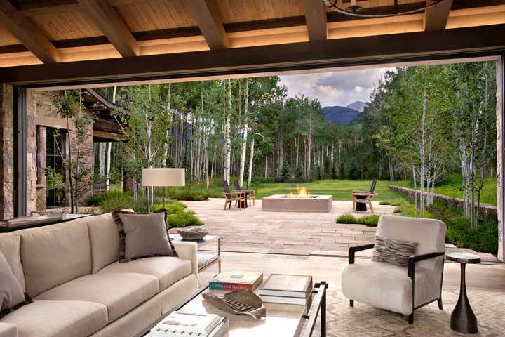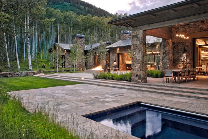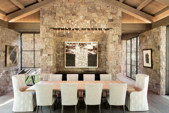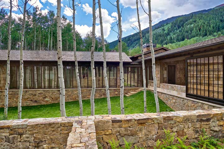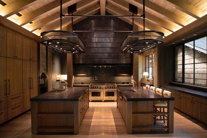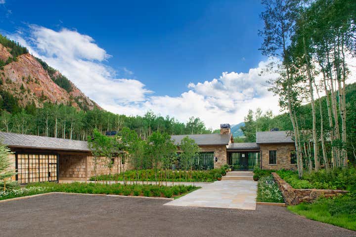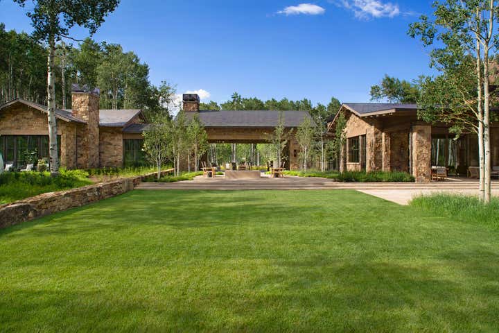 Nestled in an Aspen forest is the 12,000ft2 and completed in 2018, Rivers Edge Residence harmonizes architecture with the natural and built landscape. The home blends into with the landscape using moss rock, Poplar Bark shingles, cedar and copper roof shingles. Expansive thirty foot sliding steel door openings center on Mount Hayden and draw in the beautiful landscape. Expansive glass halls connect the rooms and forms. The refined interior uses a minimal amount of finishes to unify the architecture. Refined materials like bronze, reclaimed white oak, leather and hand forged steel alongside custom lighting and textiles add a layers of detail to the architecture . Ridge and gable form with connecting glass elements make up the architecture. The kitchen features a double island that centers the Wolf range with the steel and copper shingle hood that stretches to the ridge. Together with Urban Electric Company, we designed two large fixtures over the islands that anchor the kitchen. Overall, the design and pallet kept for a warm inviting home for a family that loves the outdoors.