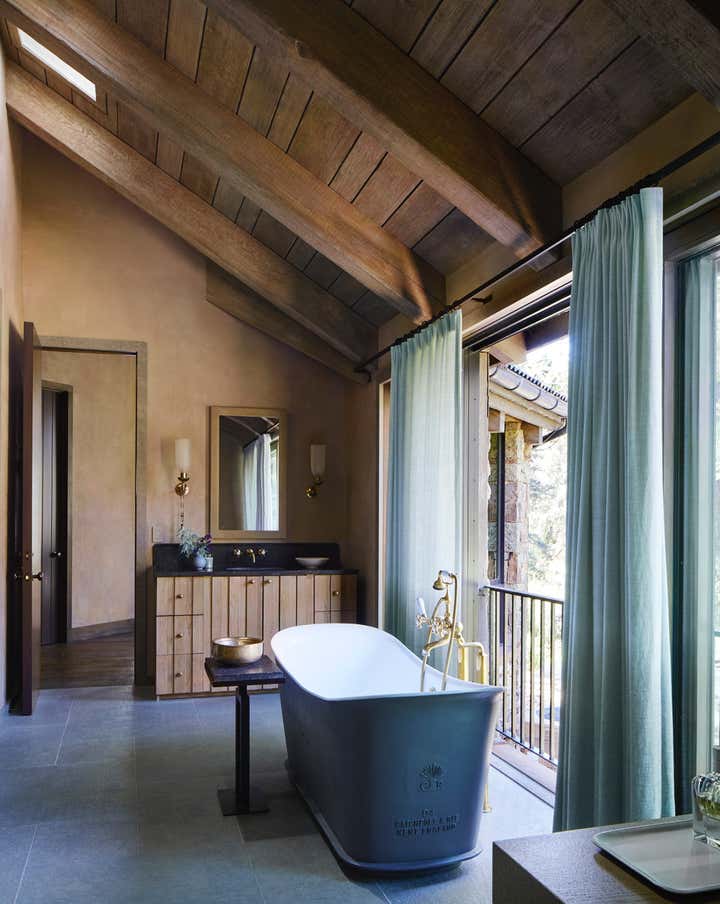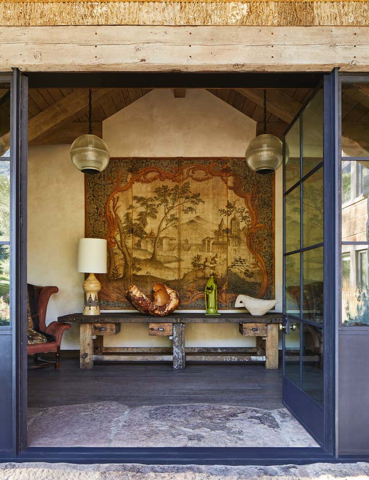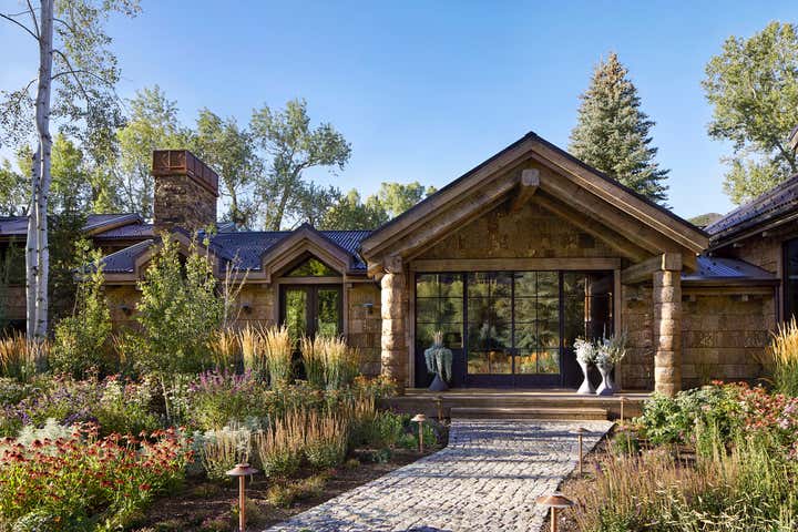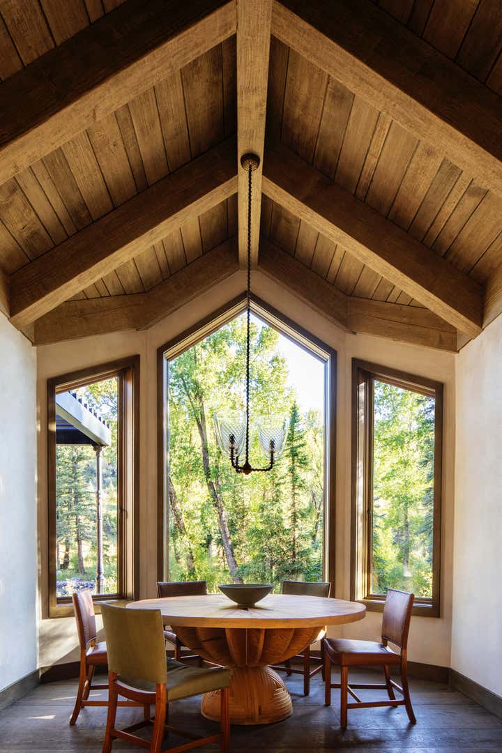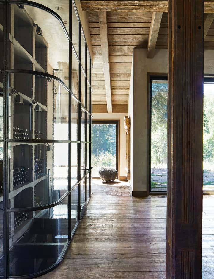 Country River Home situated on on the foot of the Roaring Fork River Near Aspen Colorado. This 8000 square foot home embraces the land with materials that flow from the exterior to the interior. Character rich materials create a soft palette throughout the home. Soil from the site was used in the plaster and oak from old fermenting barrels was used in the kitchen.