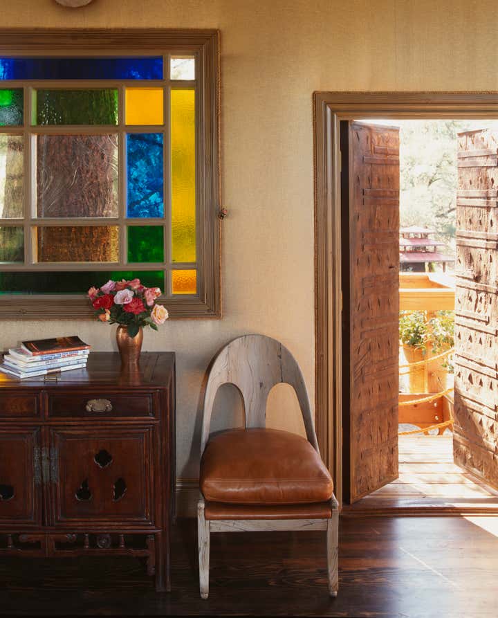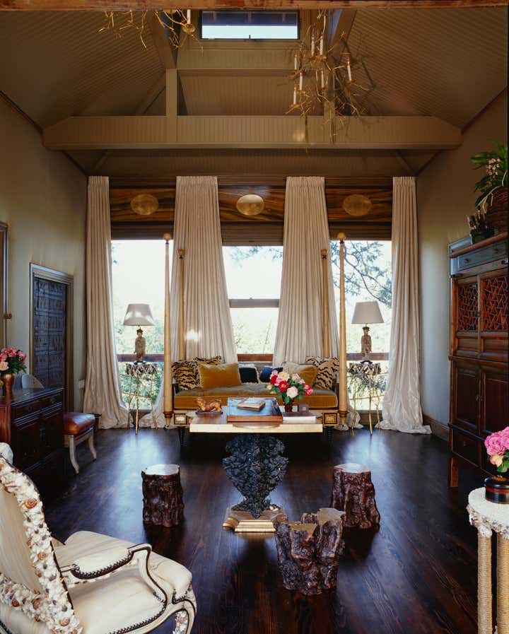 What began as an idea to create an intimate folly in a magnificent pair of ancient fir trees became rather grand when the arborists revealed how large a platform the trees could support. On nearly a twenty by twenty foot platform we were able to create a rather substantial, fully plumbed and wired structure that could function as both guest cottage and art studio. The main living space sits within a “U” shaped porch that offers views in three directions. On the fourth side of the structure we located utilities, which include — to the dazzling surprise of visitors — a flush toilet. As the structure was going up we found two pairs of vintage Indian doors, one rustic and the other fanciful Victorian with a lacy transom, and decided to use these doors as focal points of the construction. The unusual height of the doors with the Victorian transom mandated the dramatic height of the tree house walls. We further exaggerated the height by incorporating a windowed cupola that vents hot air out in the summer months. The structure is a whimsical exercise in surprise and contrast; we clad the exterior in rustic redwood so that it would blend into the natural setting of the trees over time, but created a jewel box interior using glittering finishes and fabrics together with luscious silk velvets on the walls, windows and furnishings. To further the sense of amusement, a zip line off one side provides for a quick escape.