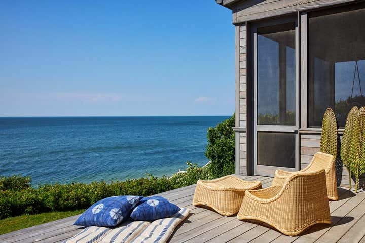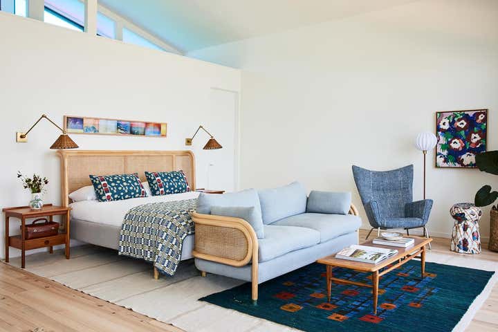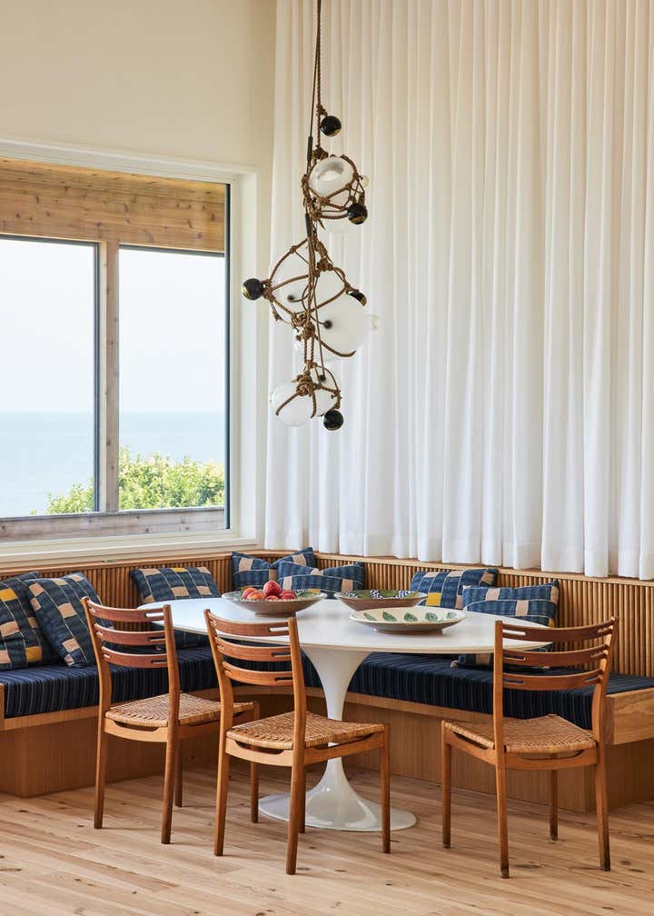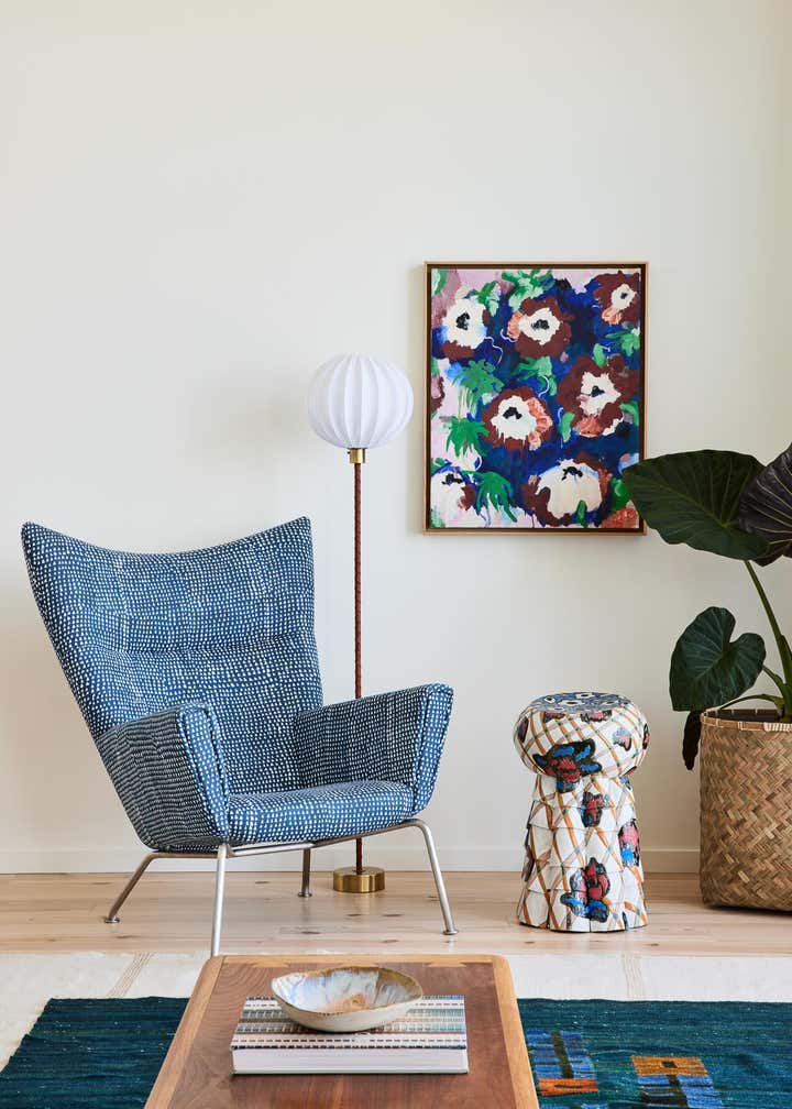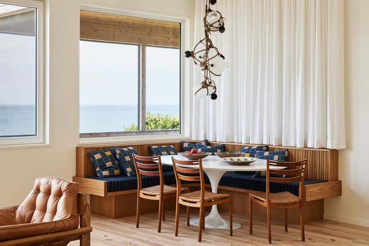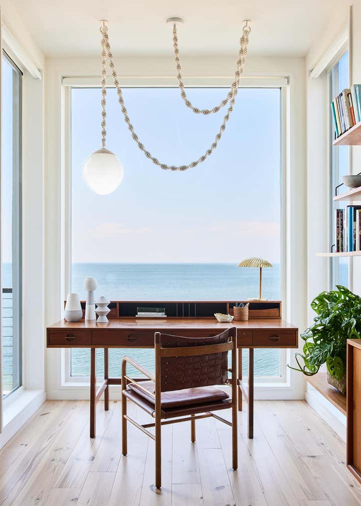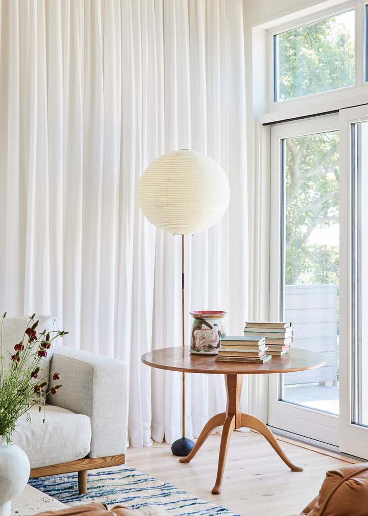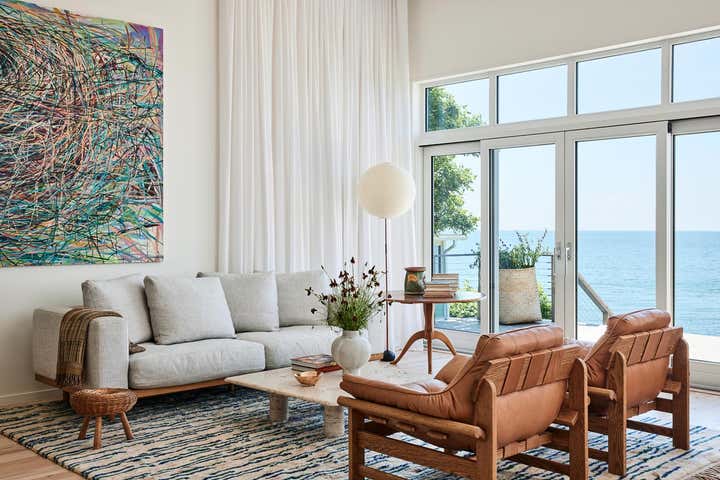 This home is a place for the family to recharge, connect with nature and a vehicle to inspire creativity for the owners, one of whom is a writer. The use of color inside is a foreground to the stunning view of the blue sky and water and adds balance and interest to the interior. The blue color is a thread that continues throughout the house. The home is also a vehicle through which to start a collection of important design pieces. We love the opportunity to blend high design with more affordable and practical pieces, so you can see a vintage Noguchi lamp from the 1950s paired with a sofa from West Elm.