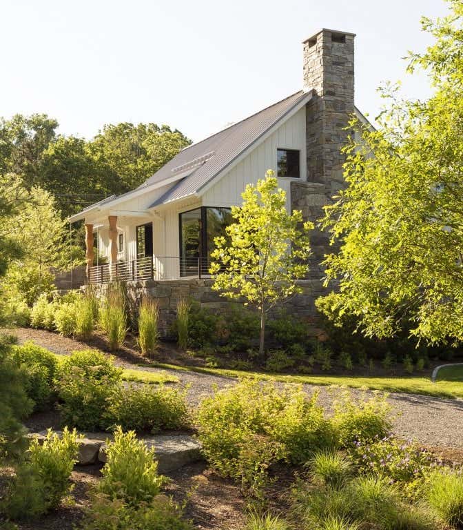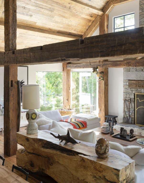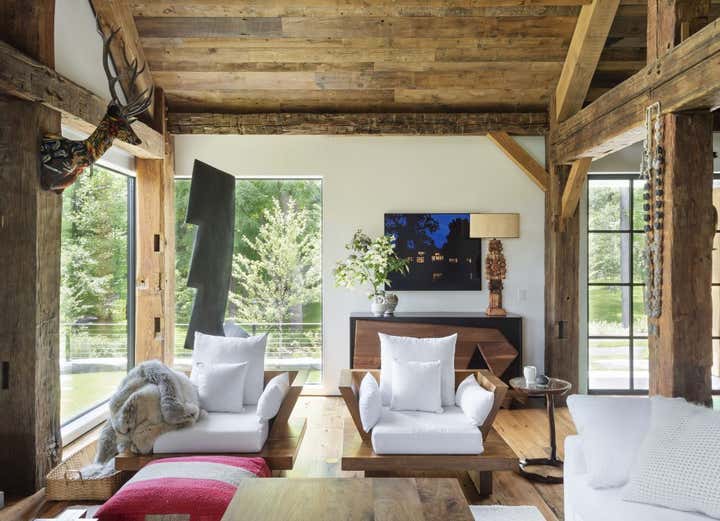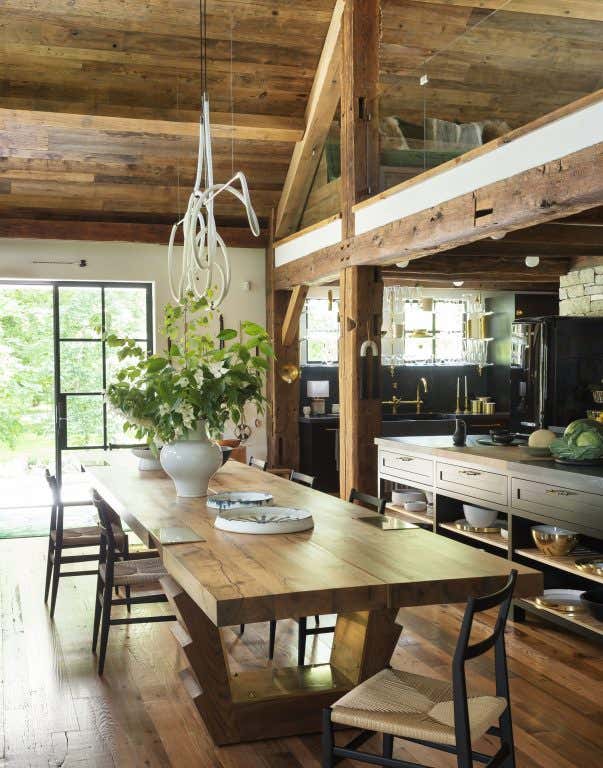 “The Lodge” is the latest addition to a family retreat in New York’s Finger Lakes region. The owner’s passion for wood work inspired the timber frame beams and columns constructed of repurposed wood from two historic, reclaimed barns. Furthermore, select furnishings and the hardwood flooring was reclaimed and restored from century old bog oak dredged from the Erie Canal. To accommodate the growing family with as many as 19 members visiting at a time, a large oak, walnut, and brass table designed by artist, Fitzhugh Karol, sits between the kitchen and living room and serves as the main focal point upon entry. This project remains true to the The Brooklyn Home Company's ethos of white, wood and traditional materiality but it also incorporates a commitment to eco-conscious construction with geothermal wells to produce a low-cost and low-carbon footprint for heating and cooling the property, and spray foam insulation throughout for energy efficiency.