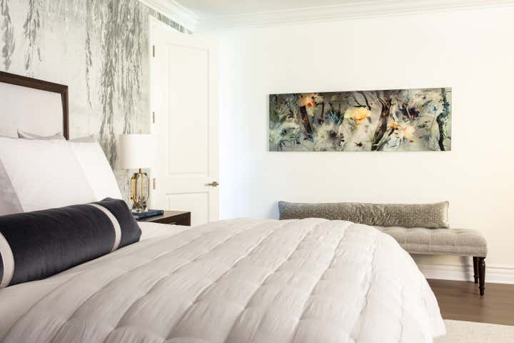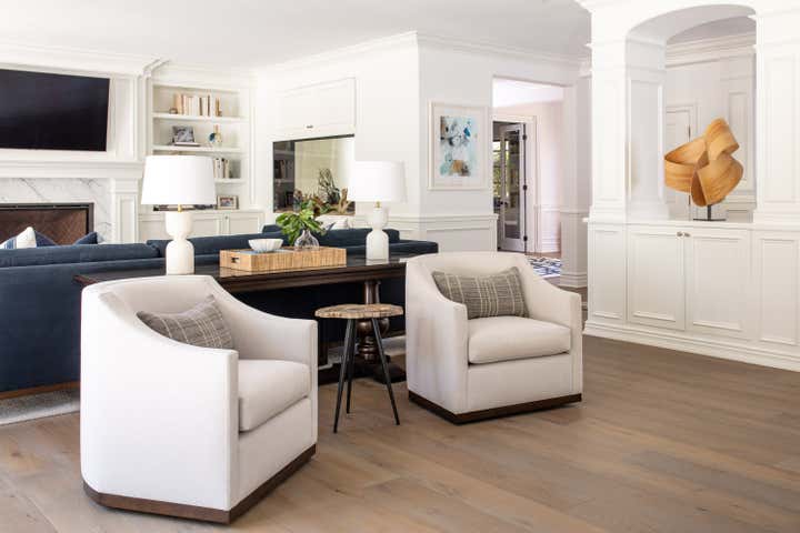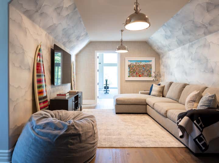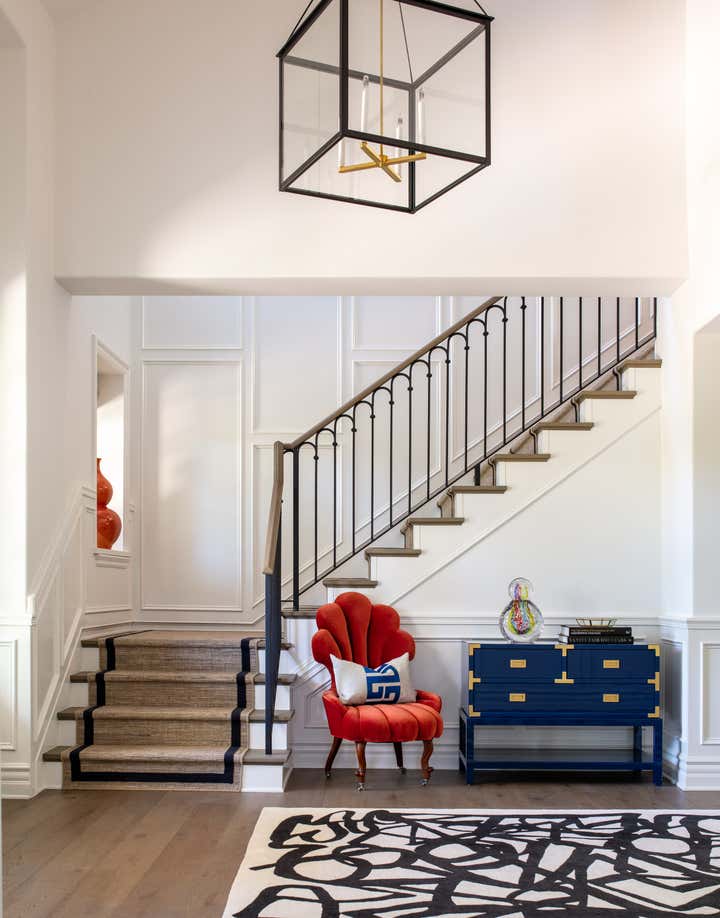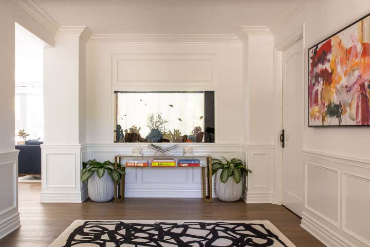 With art as the driving life force of this project, what lies beyond the threshold of this seemingly traditional home is anything but conventional. We were blessed with clients who welcomed and shared our vision to playfully invigorate the home’s traditional design with contemporary accents and bright colors, and their adventurous spirit is made tangible through paintings, sculptures and curated objects throughout all areas of the home. Artist-made surf boards in the kid’s bonus room, a saltwater aquarium teeming with tropical fish, and custom furnishings such as a dining room cabinet made to house inherited family china are just a few of the many ways we chose to extend the clients creative nature into the design of their space.