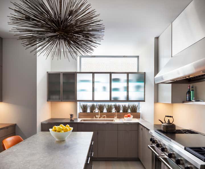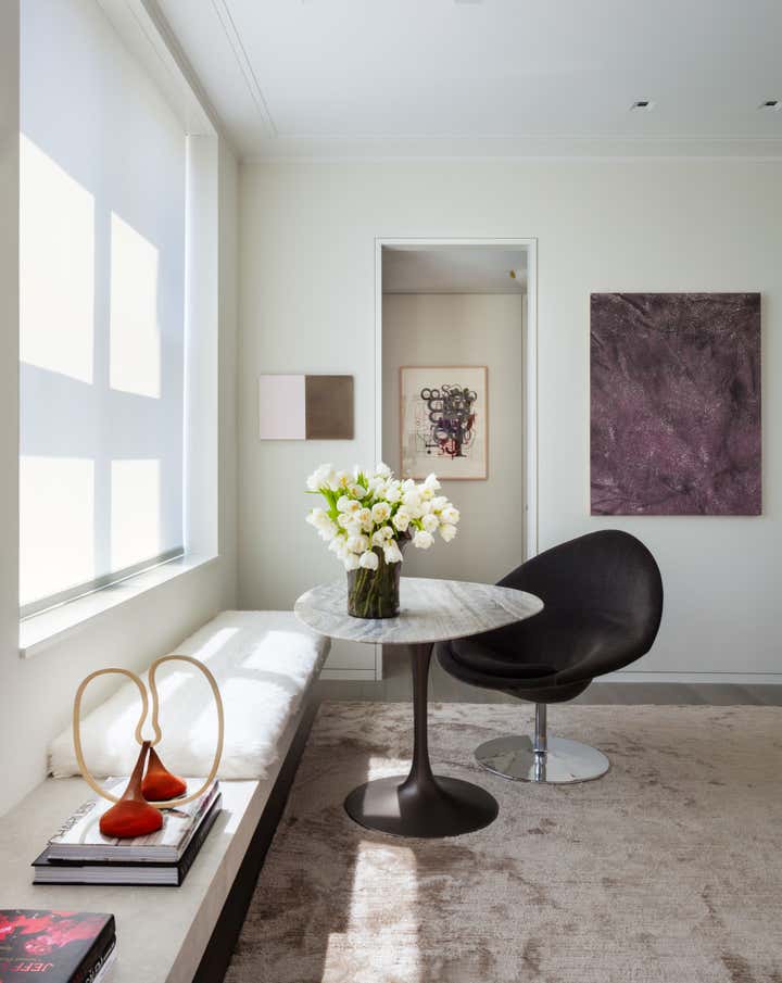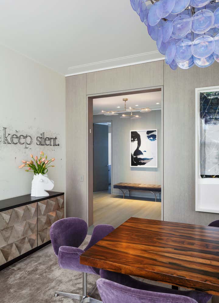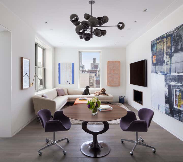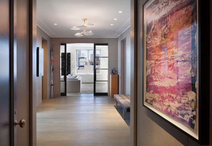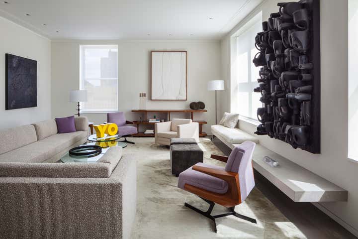 This 4,500-square-foot duplex was selected by the owners because of the amazing light and space to display their art collection. Located in a 1916 prewar building designed by Robert T. Lyons for the real-estate developer Bing&Bing, the two apartments had been joined in the 80's and not been touched since. The architectural approach became one of "Domesticated Modern". There is a shallow abstracted cornice where the walls meet the ceiling however the baseboards are flush. The casing around the doorways is minimal and the windows have no trim to maximize the light in the space. The upstairs of the duplex is the public zone, including a dining room, living room, den, kitchen, scullery and guest suite. Beneath is an elaborate master suite complete with his and hers dressing rooms, bathrooms, offices and shared sleeping quarters. The furniture combines unusual mid-century finds, Italian lighting fixtures from the 60's and custom pieces.