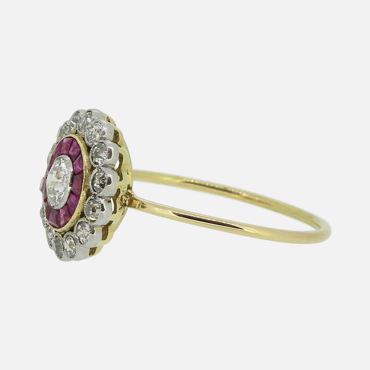 Hier haben wir einen bezaubernden Ring mit einem runden, facettierten Diamanten im Minenschliff in der Mitte, der einen brillanten, reinweißen Farbton ausstrahlt. Dieser Hauptstein ist von einem auffälligen Halo aus Rubinen im Quadratschliff umgeben, deren perfekt aufeinander abgestimmte rosarote Farbtöne einen lebhaften Kontrast bilden. Die Rubine werden von einer zusätzlichen Schicht etwas kleinerer Diamanten mit altem Schliff umgeben, die das Funkeln des Rings insgesamt verstärken. Gefertigt aus einer Kombination von 18 Karat Gelbgold und Platin, sind alle Steine mit einer feinen Maserung versehen, die eine luxuriöse und dauerhafte Grundlage bietet. Ein schmales, glatt poliertes Band vervollständigt das Schmuckstück.