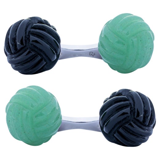 Alex Jona reist häufig, und die auf der ganzen Welt gesammelten Edelsteine sind ein fester Bestandteil von Jonas Schmuck - er entwirft persönlich Stücke mit Steinen wie Lapislazuli, die zu augenähnlichen Manschettenknöpfen geformt sind, Saphire, die in 14-Karat-Gold gefasst sind Ringe und Quarzkristalle, die zu modernen Perlenketten gestapelt sind. Emaille, eine der ältesten Formen der Oberflächendekoration, wird oft zu grafischen, abstrakten Mustern oder zu frechen Augenzwinkern arrangiert, wie etwa Miniatur-Tennisbälle auf Manschettenknöpfen. Selbst glitzernde Stücke, wie die diamantbesetzten Ohrringe , wirken organisch, wenn sie in Form eines blühenden Gänseblümchens angeordnet sind.