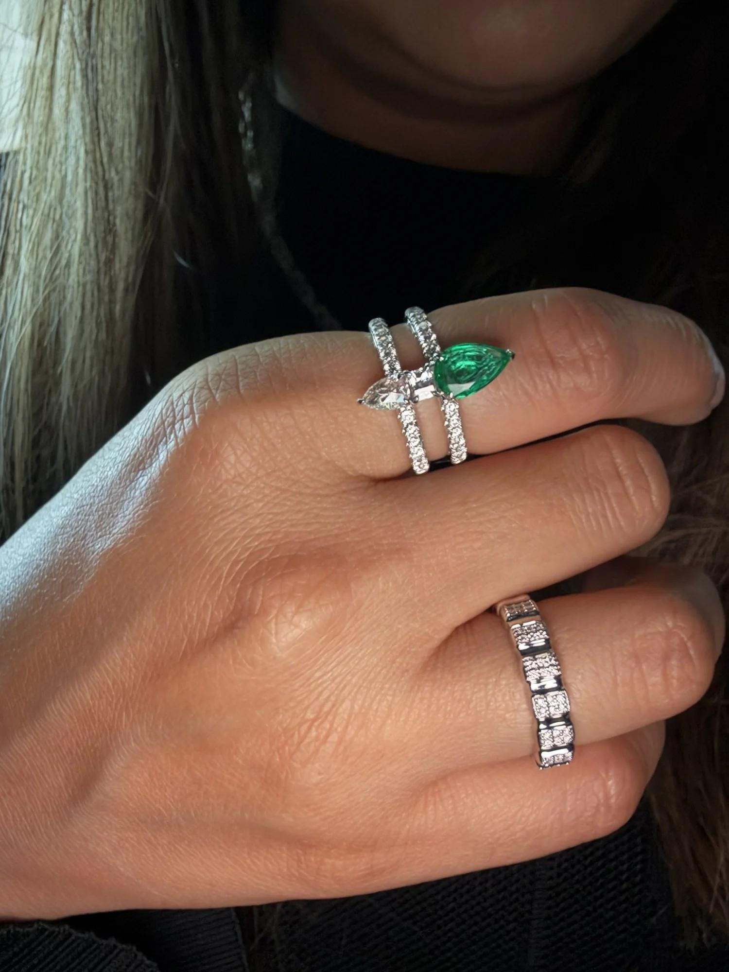 Enlightenment Ring aus Weißgold mit zweireihigem Smaragd und Diamanten im Phantasieschliff