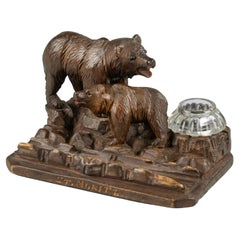 19th Century Inkwell – Black Forest – Carved Wood – Two Bears