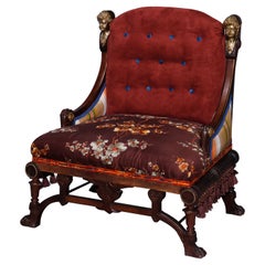 An antique Egyptian revival figural slipper chair offers carved walnut frame with upholstered button back having flanking gilt bronze mounts of young women, c1870