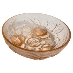 Muller Frères Lunévill Art Deco Peach Frosted Pressed Glass Rose CenterpieceBowl