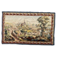 Beautiful mid century fine french handwoven Aubusson tapestry « The village »