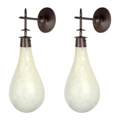Two wall sconce with hand blown glass with a white fret. Each sconce is unique in form. The bronze wall attachment is made to work with a standard J box. Light uses one candelabra ba...