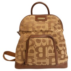 A Burberry backpack made of brown/beige fabric with Burberry logo, brown leather trim, and gold toned hardware. The interior is lined with a synthetic brown fabric and next to the ma...