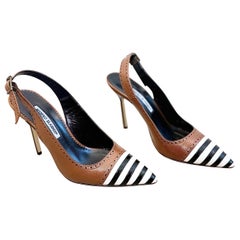 Manolo Blahnik Size 39 / 9 Brown Leather Black White Striped Toe Slingback Pumps