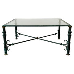 I love this table! It dates from the late 1970s, and is takes inspiration from Diego Giacometti. This Etruscan style, hand wrought iron square glass top coffee table with brass deta...