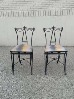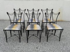 A rare set of six bespoke patio or garden dining side chairs in forged metal with bronze and handcrafted by artist Mario Villa (1953-2021). Sculptural raw steel frames with artist ap...