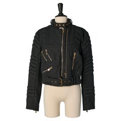 Anthracite wool padded biker jacket. Black rayon lining. Strap around the collar with snap. Double zip closure on the middle front with branded zip puller. Pocket with zip closure. H...