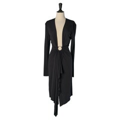 Navy blue jersey cocktail dress with deep V neckline . Metal ring with rhinestone on the middle front on the waist. No fabric composition tag but probably rayon and elastane. Split o...