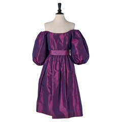 Purple stiff taffetas cocktail dress . Taffetas composition: acetate. Same fabric inside the top part of the dress. Boned on both side. Hidden zip closure on the middle back. Belt in...