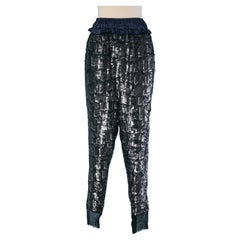 Silver sequin trouser . Main fabric composition: 90% rayon, 5% polyester, 5% silk. Rayon lining.Elastic band on the waist with gather and raw-edge. Pocket on both side.