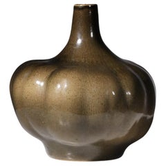 Large ceramic vase by the English artist Tim Orr from the 1970s. Its asymmetrical, organic shape is reminiscent of a pumpkin. The ceramic is glazed in muted khaki tones. In very good...