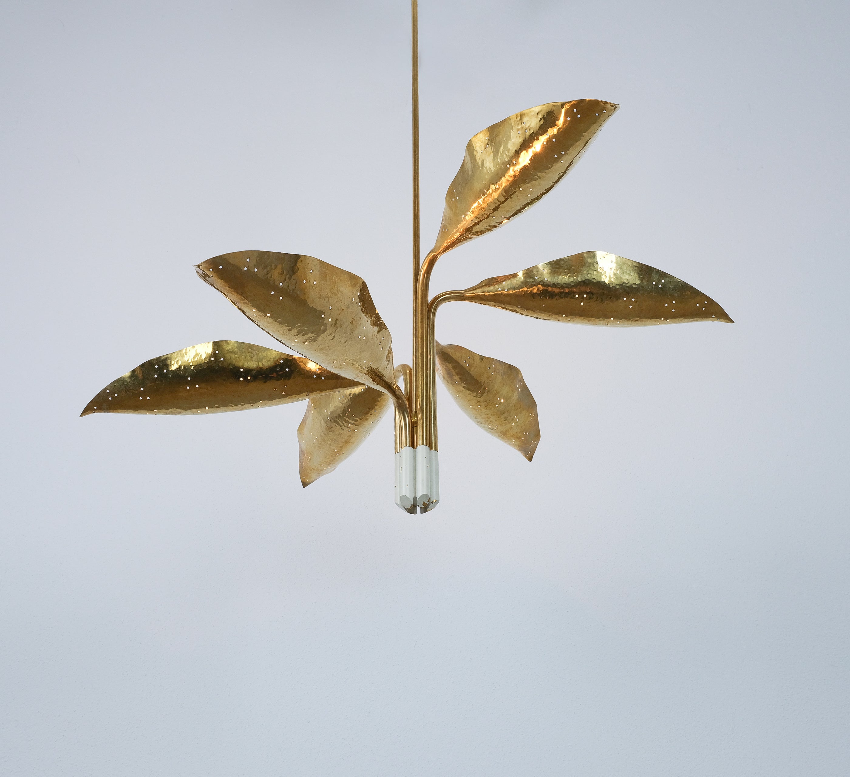 Organic chandelier designed by Angelo Lelii for Arredoluce. The composition unfolds through six leaf...