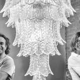 The five-tier chandelier is made of a chrome frame and white and clear Murano glass petals.