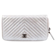 Chanel silver-tone metallic quilted lambskin leather wallet featuring a silver-tone signature interlocking “CC”, quilted smooth navy lambskin leather, a top zip opening, inside comp...