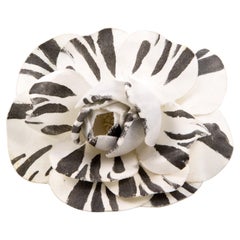 Chanel White & black silk Camelia brooch featuring flower shape, black brush print details, a back bar-pin closure, a logo plaque.