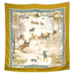 Hermes silk scarf « L’Hiver » by Philippe Ledoux featuring a caramel border and an Hermès signature. 100% silk.